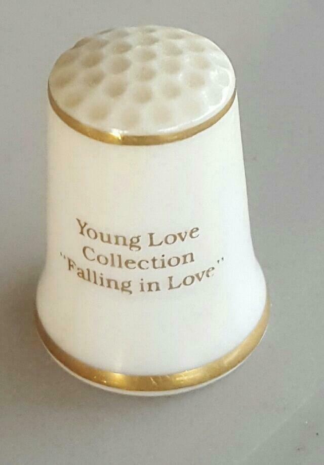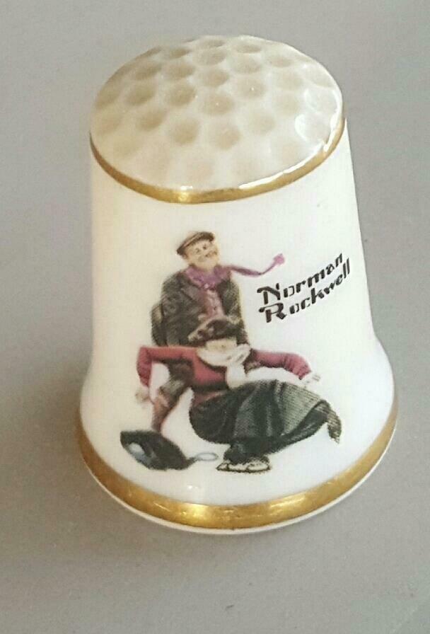 Offered here is this Very Nice Porcelain Danbury Mint Thimble from 1980. It is from the Norman Rockwell Young Love Collection and is "Falling In Love". The thimble is in very good condition with no chips or cracks. it is dated 1980. It is a standard size thimble, and is 1" tall, and just under 1" in diameter. It is a very nice collectible Danbury Mint porcelain thimble from the Norman Rockwell Young Love Collection.