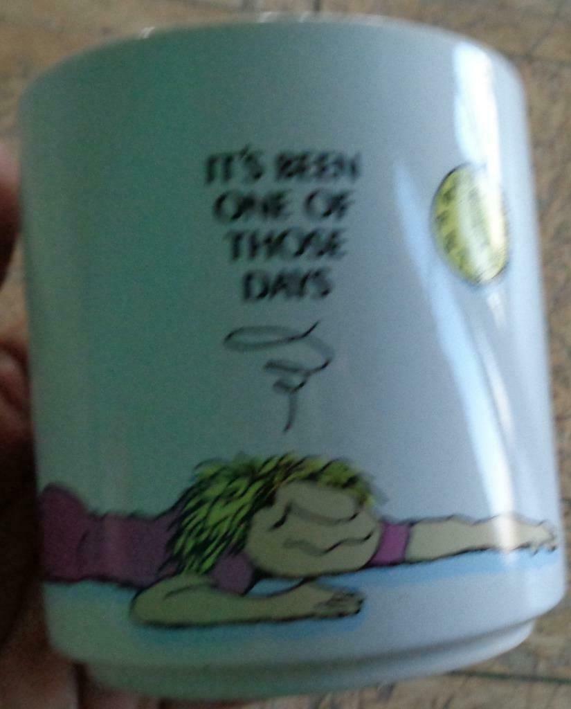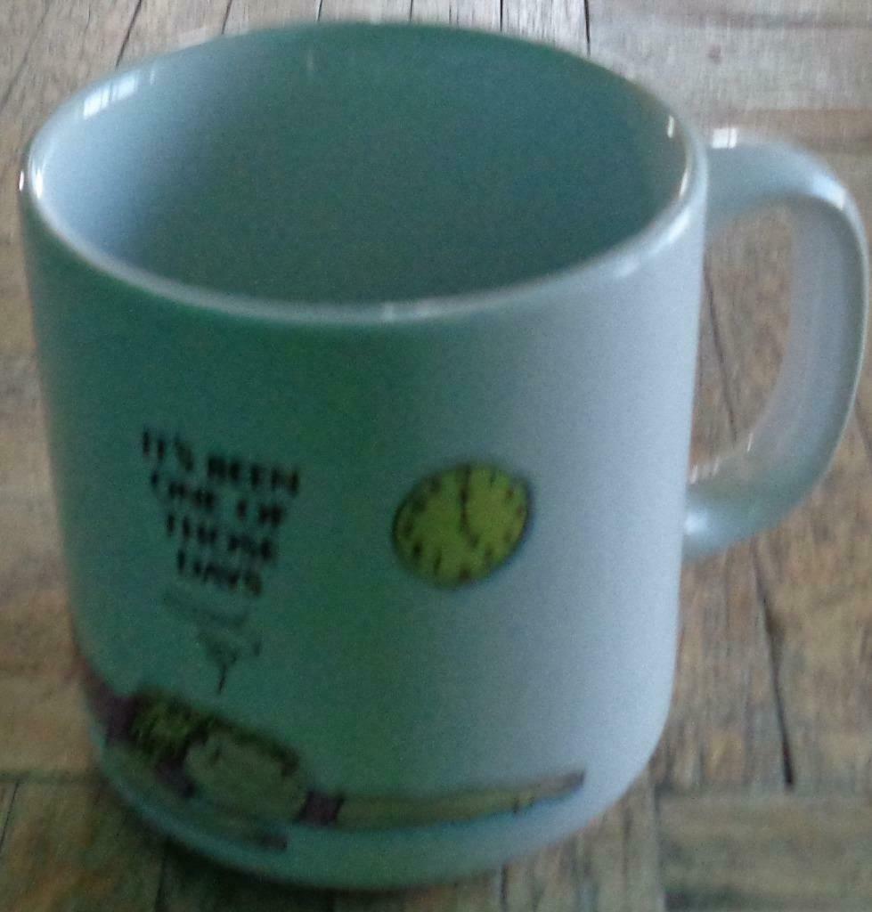Offered here is this Fabulous Very Gently Used Russ Ceramic Coffee Mug. "It's been one of those days" is the theme of the mug with a funny little transfer on it. The mug is in very good condition with no chips or cracks, and actually looks as if it may have never been used. I am unsure of its exact age. It is a fairly standard size coffee mug, and measures 3.5" tall, 3.25" deep, 3.25" in diameter, with the handle adding another 1.25" to that side. It is a very nice, very gently used Russ ceramic coffee mug. A must-have for any kitchen, or mug collection.