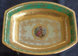 Offered here is this Beautiful Antique Bohemia Ceramic 9.25" Oval Vegetable Bowl. It is white with green band trim, and has 24 Karat Encrusted Gold Overlay on it. It has a lovely transfer of a young couple in the center. The bowl is in very good condition, with no chips or cracks, but there is some very light wear to the gold on it, in a few small areas. I am unsure of the exact age of the bowl, but it is a discontinued pattern. It was made in Czechoslovakia. It is 9.25" long, and 7.5" wide, 2" tall and 1.5" deep. It is a fabulous bowl, encrusted in 24 Karat gold, and was certainly made with wealth and elegance in mind. It is absolutely stunning and the photos just do not do it justice. It would be a magnificent addition to any antique china Collection.