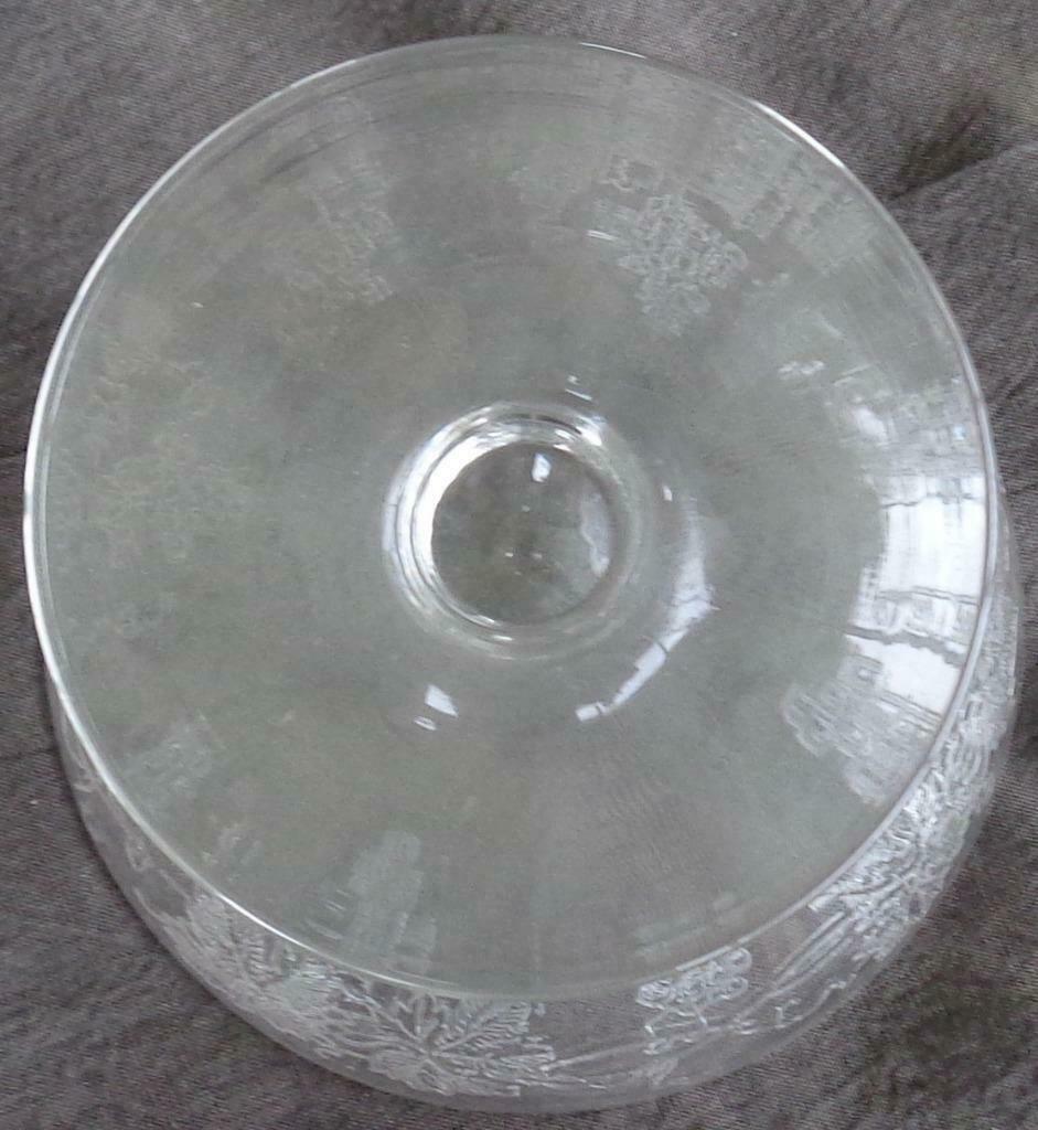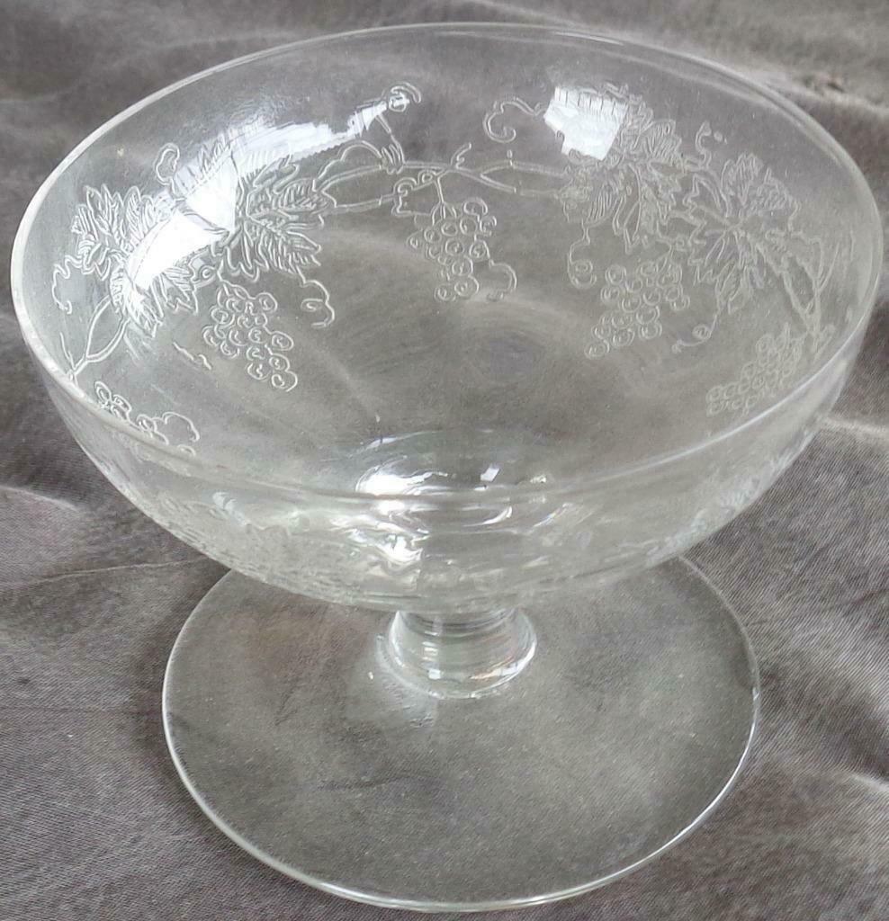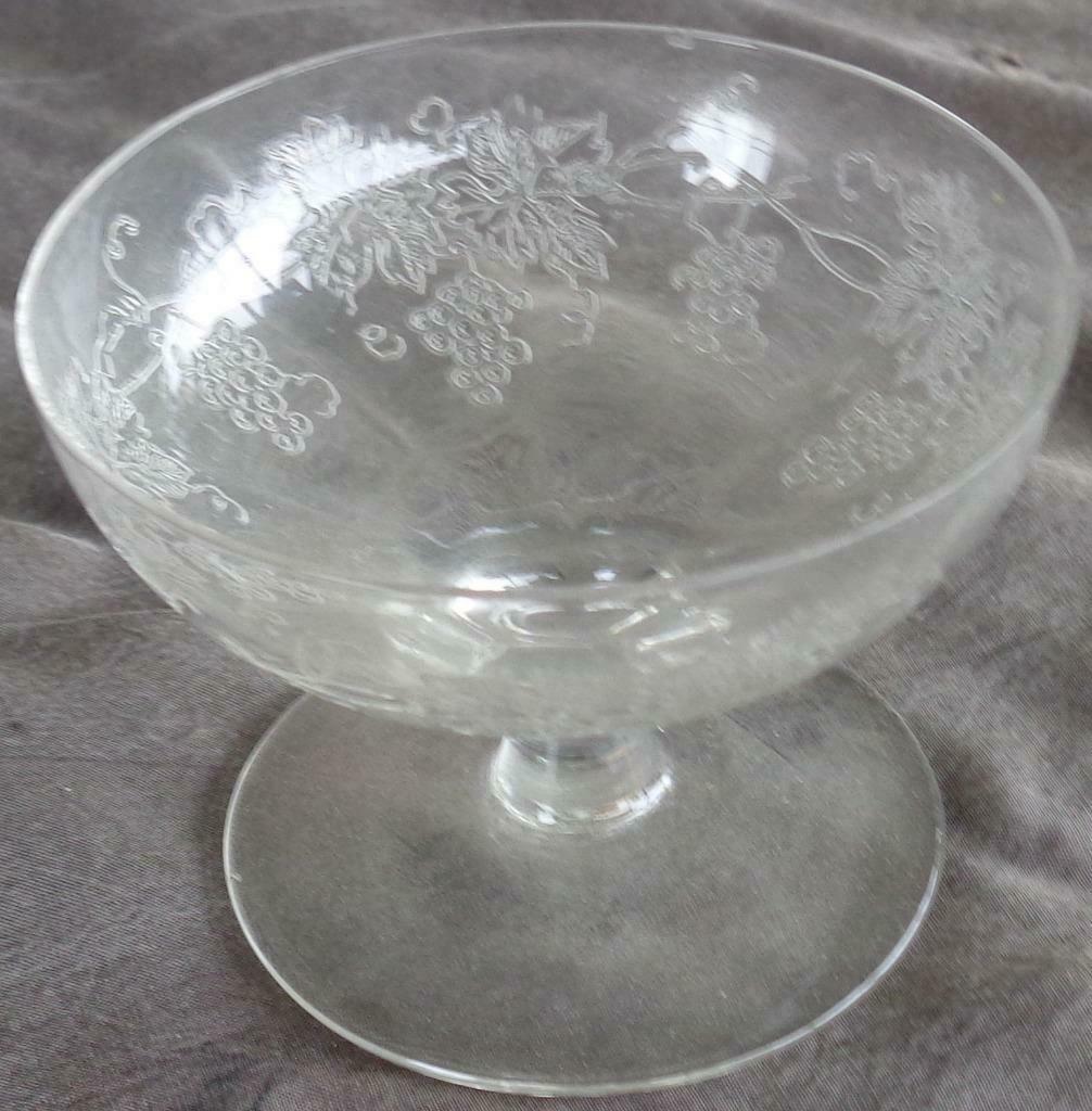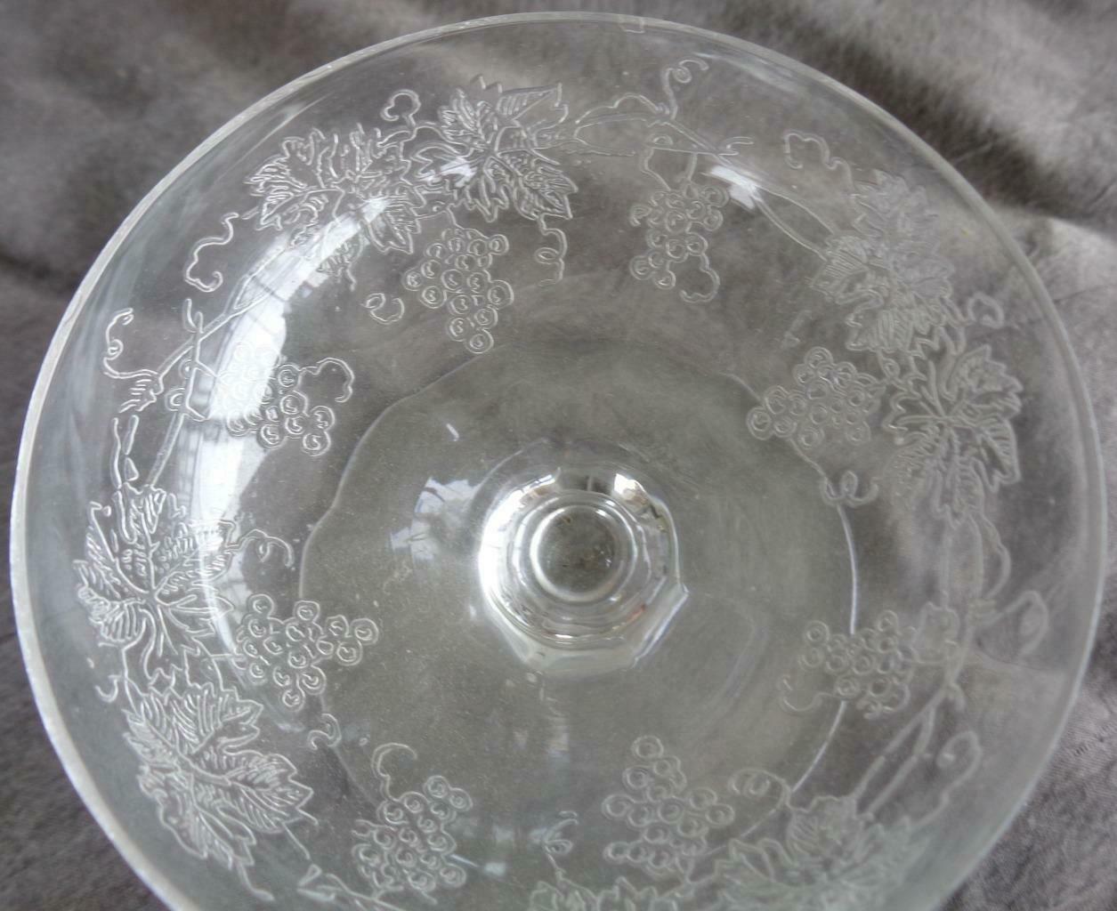 Offered here is this fabulous depression glass tiny size footed wide rimmed cordial glass. It has a beautiful etched grape and leaf vine pattern on it and is in very good condition with no chips or cracks, however, I am unsure of its exact age or origins. I am also not exactly sure of what a tiny little glass like this would have originally been used for. It stands 2" tall, is 1" deep, is 2.5" in diameter at the top rim, and 2" in diameter at the base. It is a beautiful little depression glass etched glass. It would make a very nice addition to any depression glass collection.