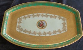 Offered here is this Beautiful Antique Bohemia Ceramic 17" Platter. It is white with green band trim, and has 24 Karat Encrusted Gold Overlay on it. It has a lovely transfer of a young couple in the center. The platter is in very good condition, with no chips or cracks, but there is some very light wear to the gold on it, in a few small areas. I am unsure of the exact age of the platter, but it is a discontinued pattern. It was made in Czechoslovakia. It is 17" long, and 11.5" wide. It is a fabulous platter, encrusted in gold, and was certainly made with wealth and elegance in mind. It would be a magnificent addition to any antique china Collection.