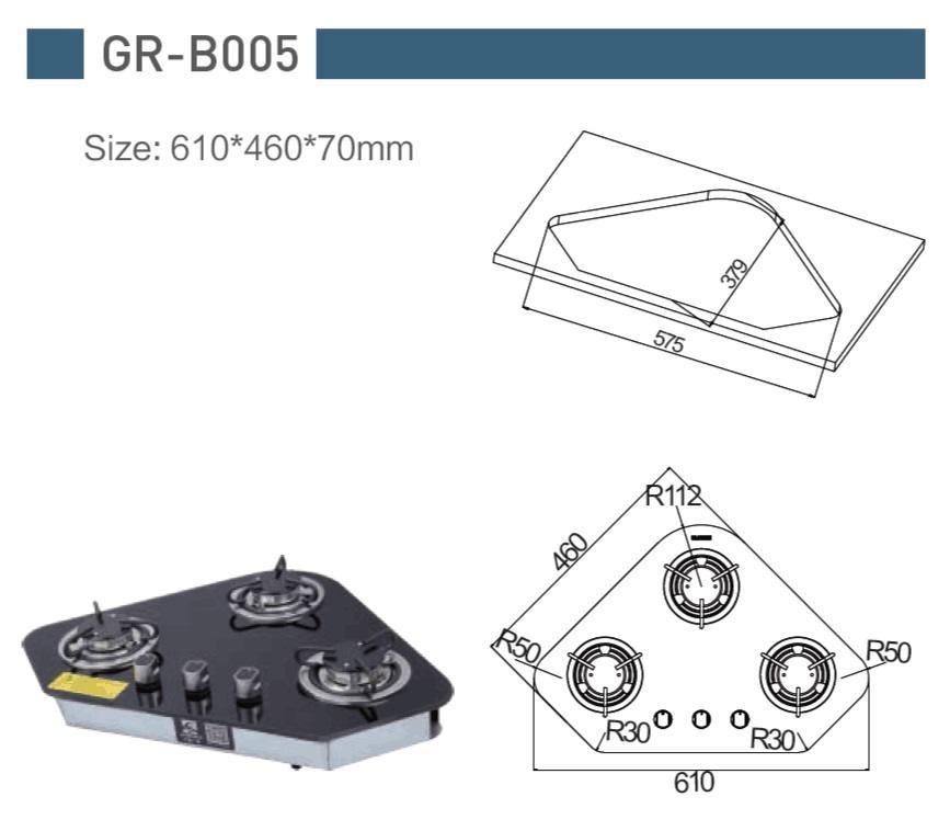 3 Burner LPG Gas Stove Hob 3*1.8KW 610*460*70mm GR-B005 Boat Caravan RV