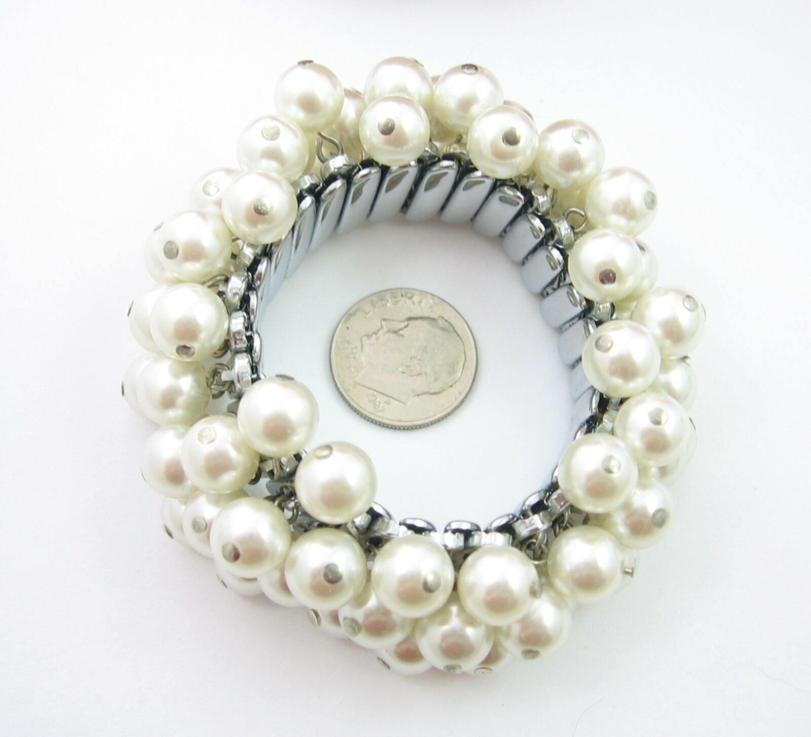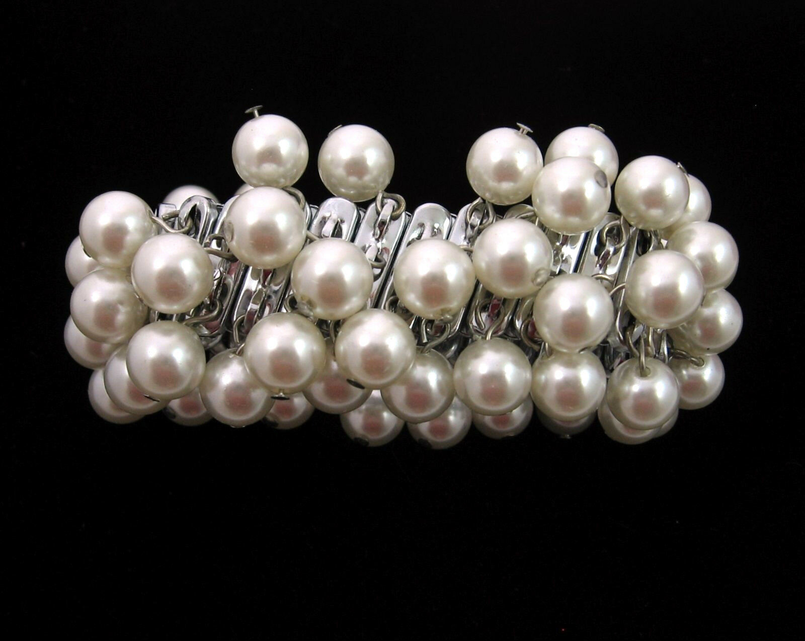 FAUX PEARL BEAD Expansion BRACELET Vintage WIDE Stretch Silvertone Japan
