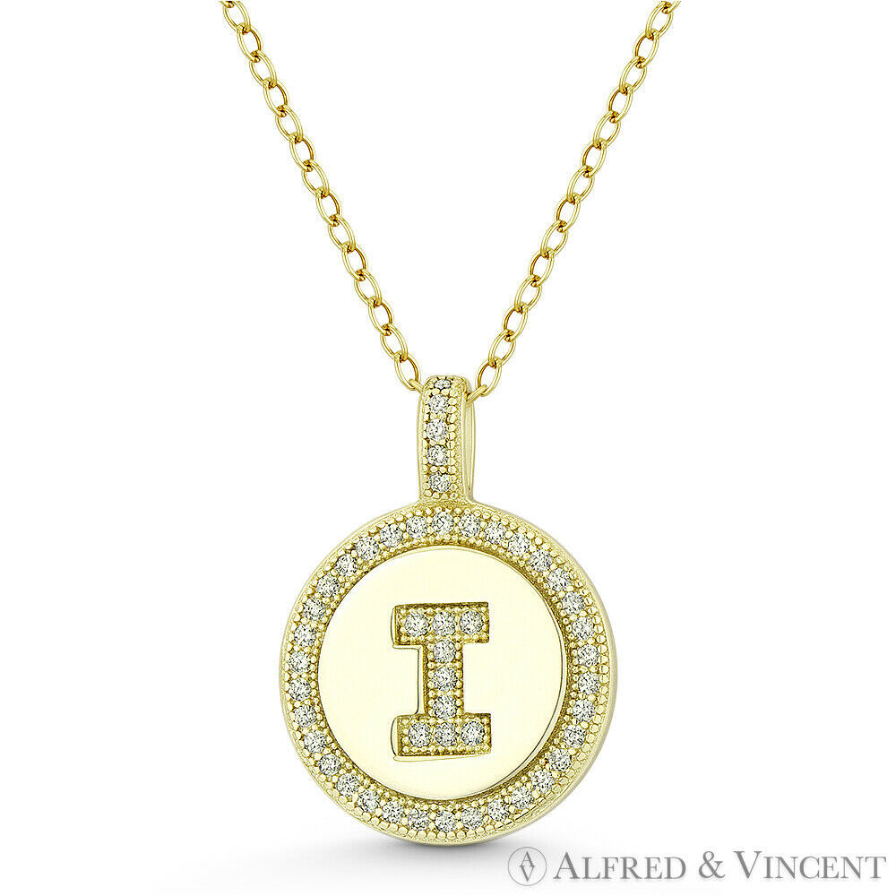 The featured pendant is cast in .925 sterling silver w/ 14k yellow gold plating and showcases a round disc adorned with cubic zirconia crystals paved along the bail, around the disc, and the letter "I" centerpiece design.