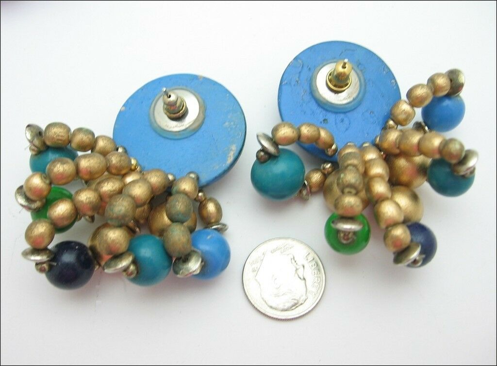 Beaded PIERCED EARRINGS Vintage BLUE GREEN GOLDTONE BEAD Wood of LOOPS Wooden