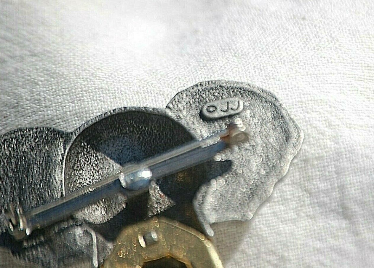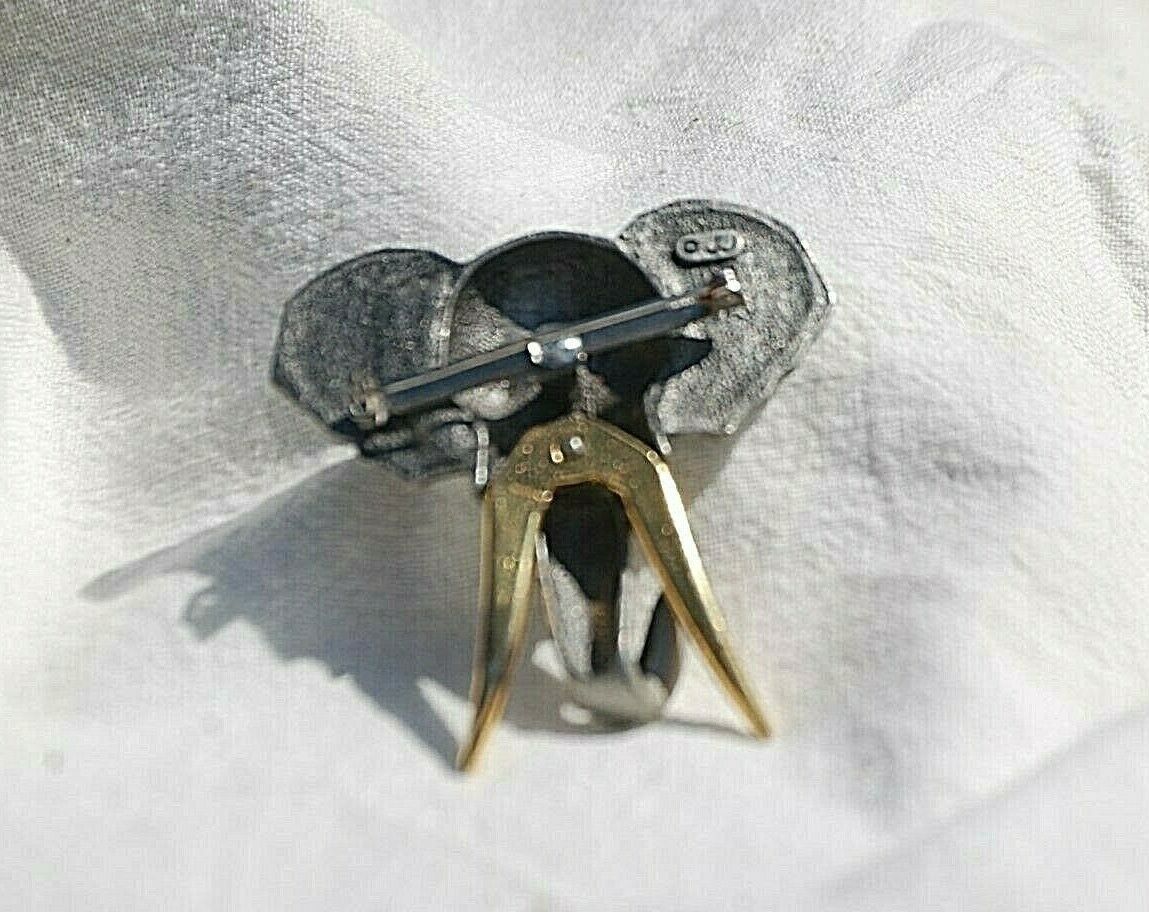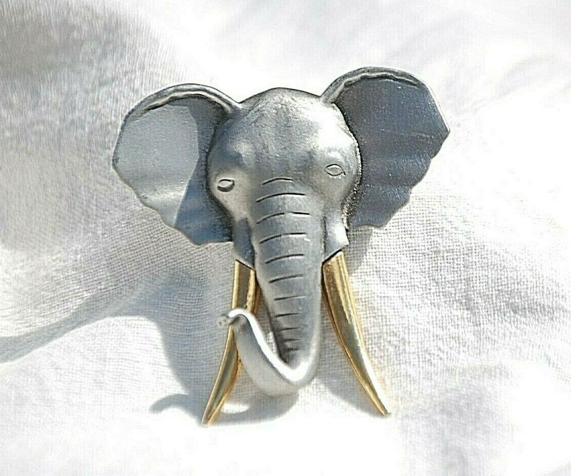 JJ Jonette Jewelry African Elephant Head Brooch Pin Pewter Gold Tone Tusk Signed