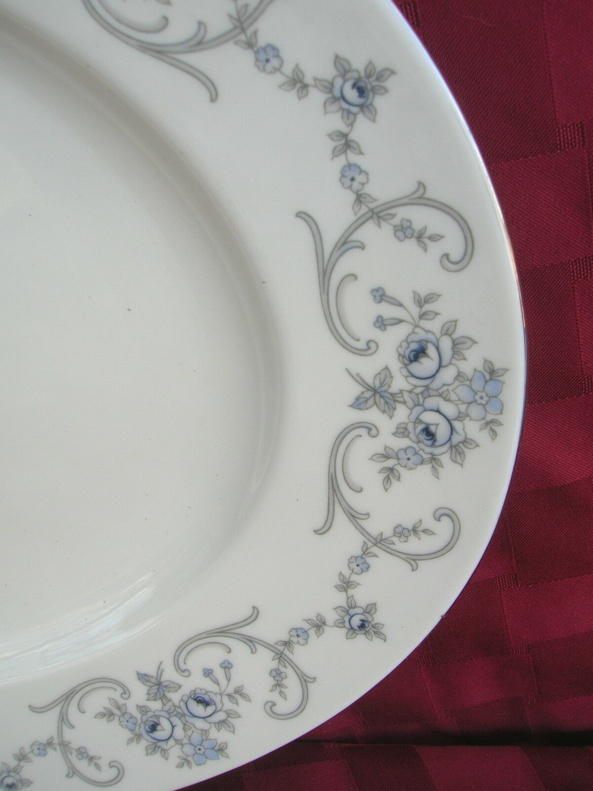 White ~ Blue Roses / Gray Scrolls w Platinum Trim |