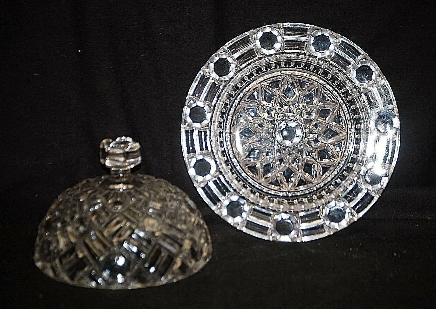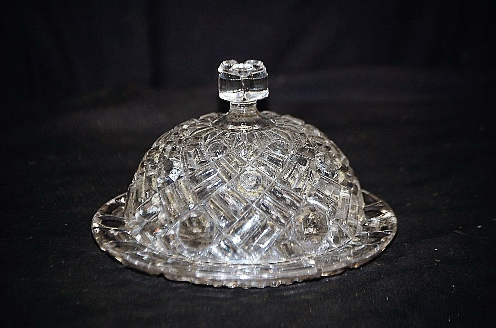 Old Vintage Button & Bar Clear Glass Pressed Cheese Domed Butter Dish MCM