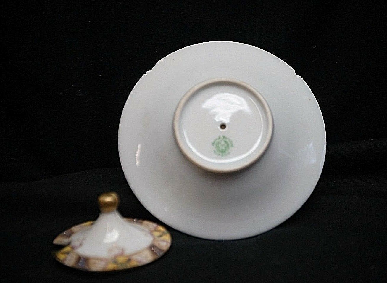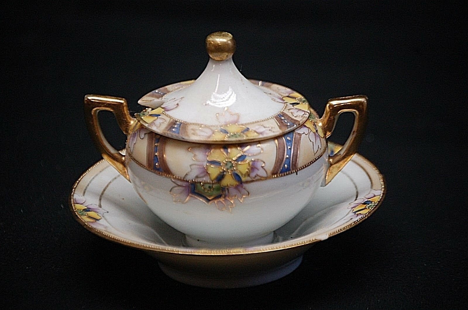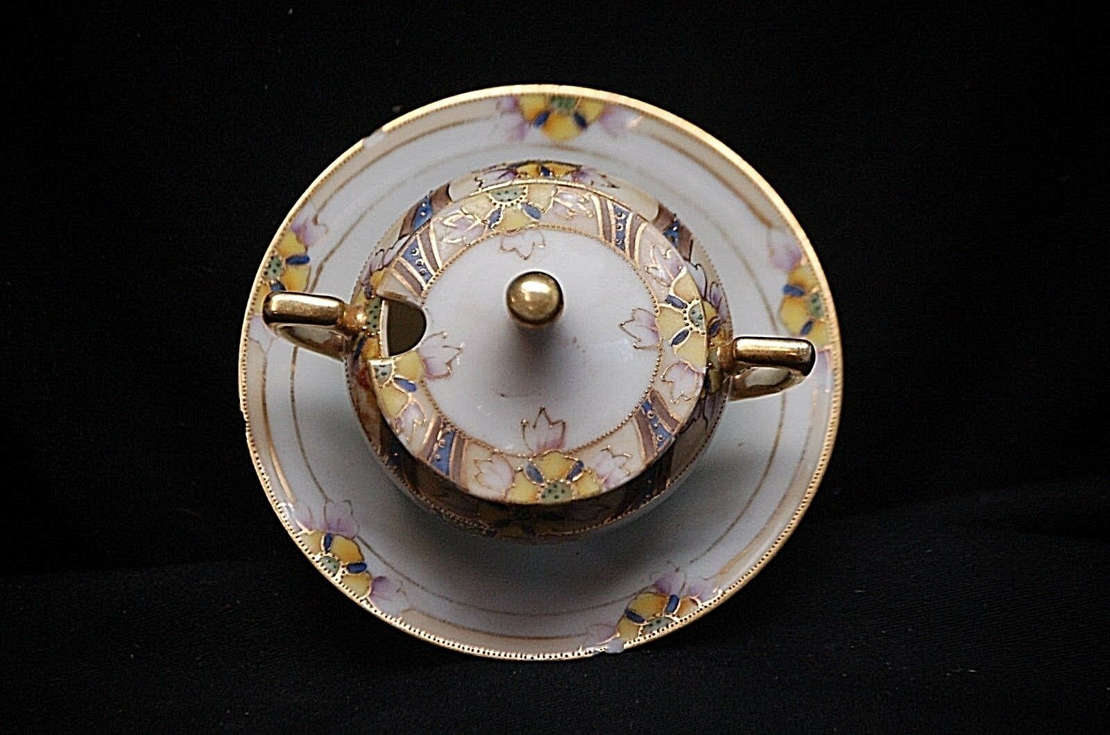 Old Vintage Hand Painted Nippon Floral Sugar Bowl Attached Underplate & Lid Gold