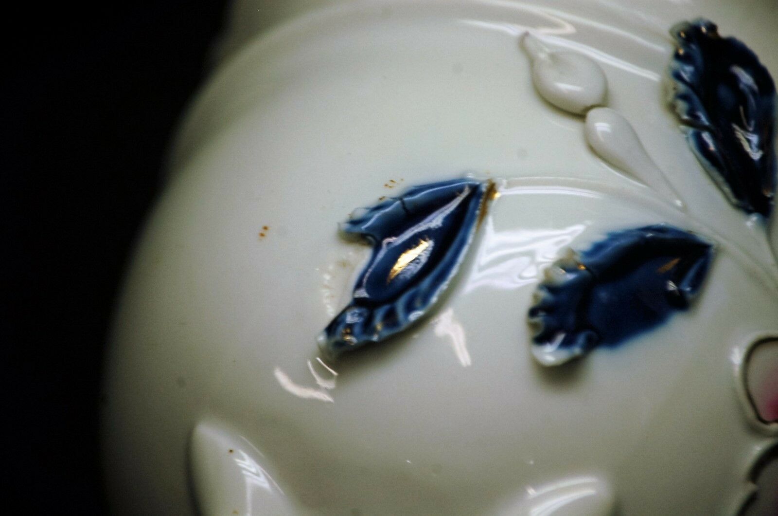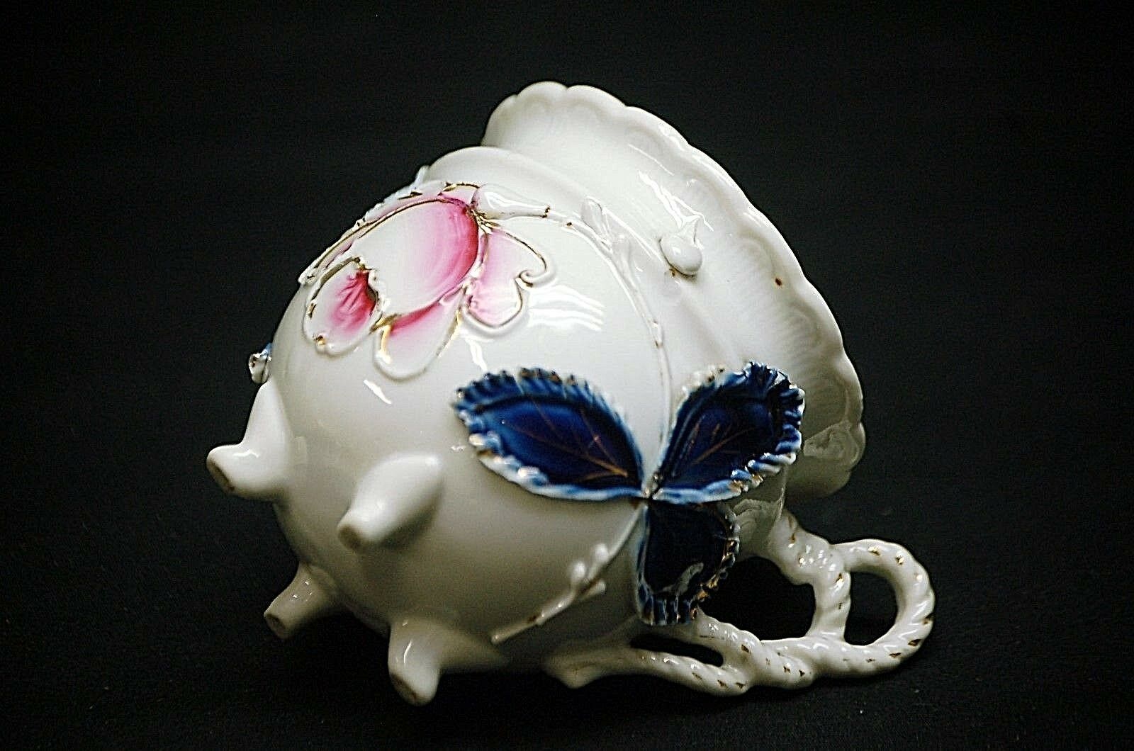 Old Vintage Porcelain 4 Footed Cup Knotted Handle Pink Floral Cobalt Blue Leaves added to cart.