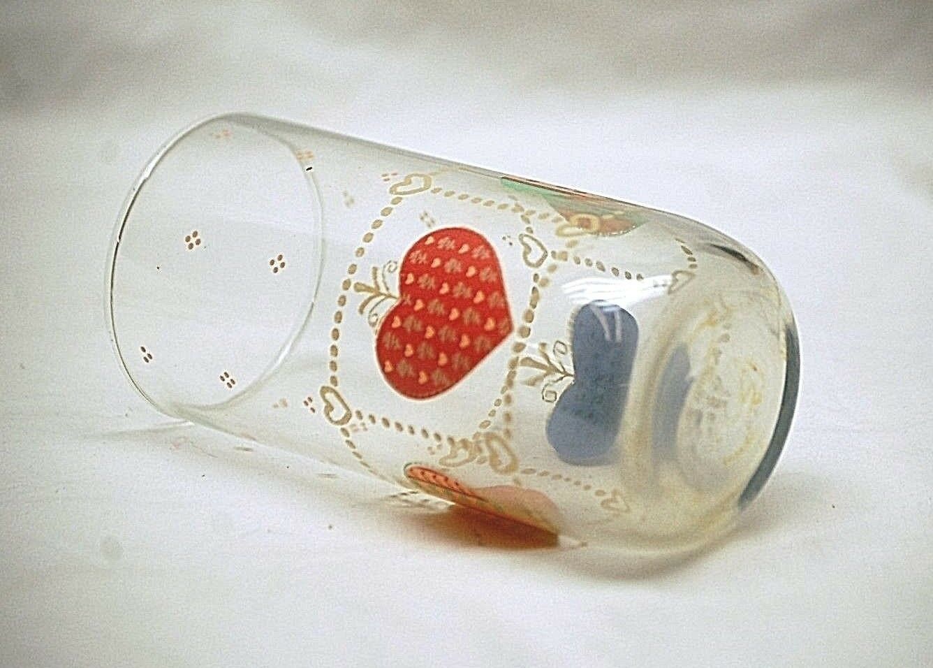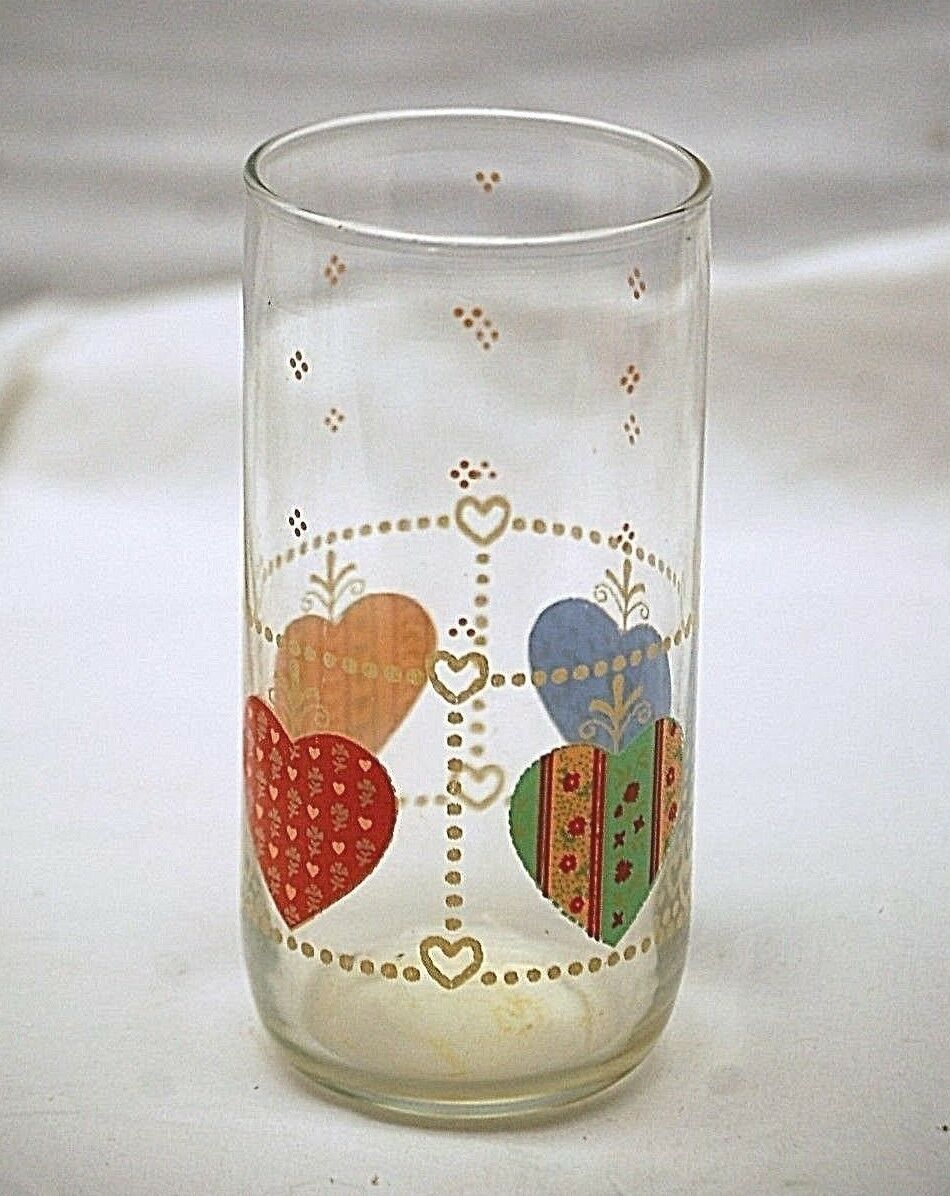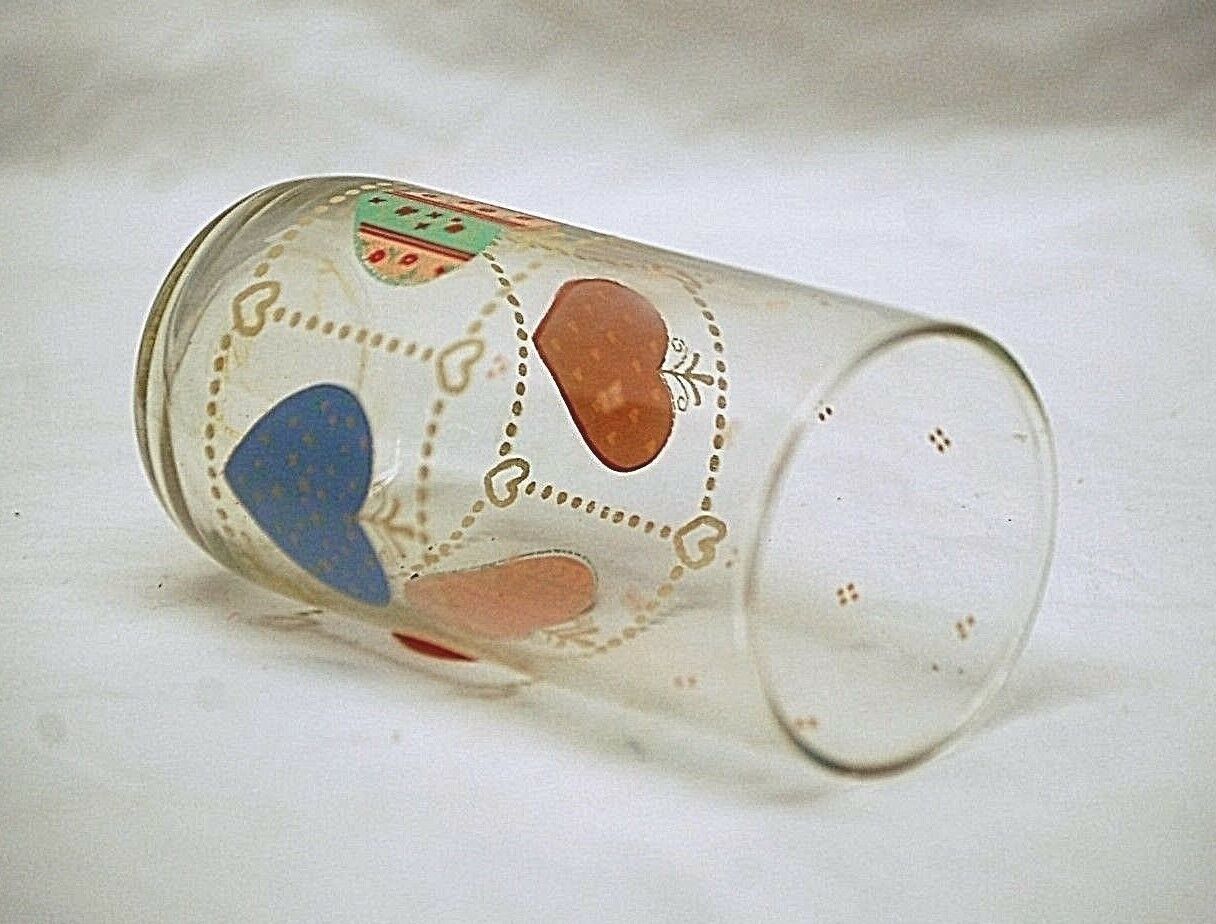 Old Vintage Quilted Hearts Tumbler by Libbey Clear Glass w Multi-Color Heart MCM