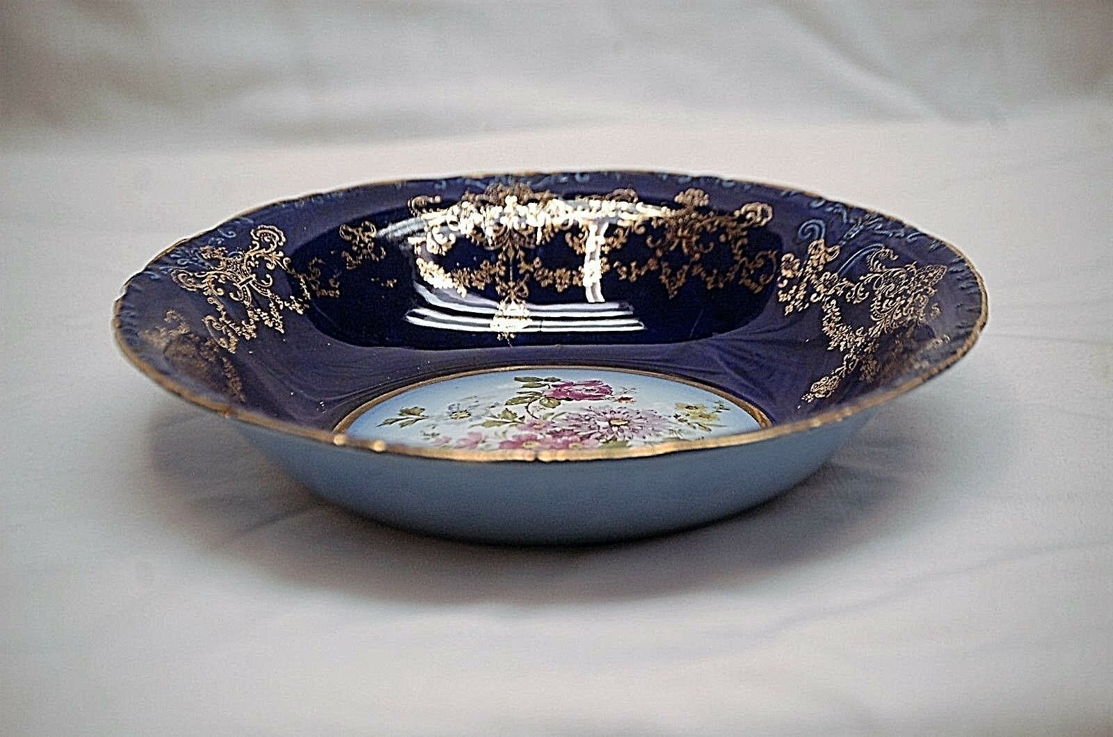 Old Vintage Ridgway England Bowl Gold Filigree Medallions Cobalt Blue Floral Ctr