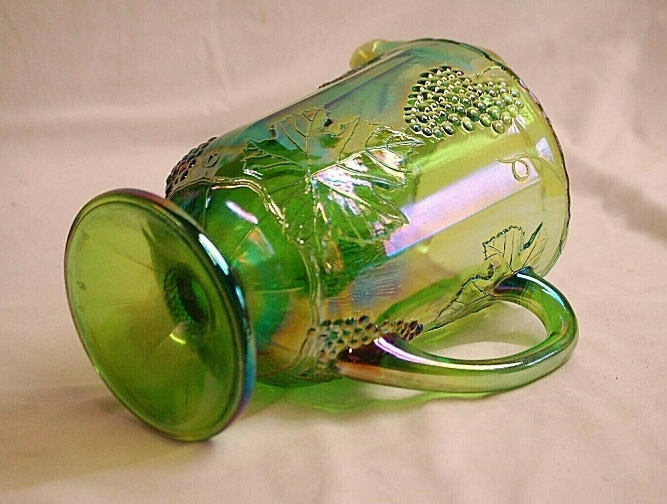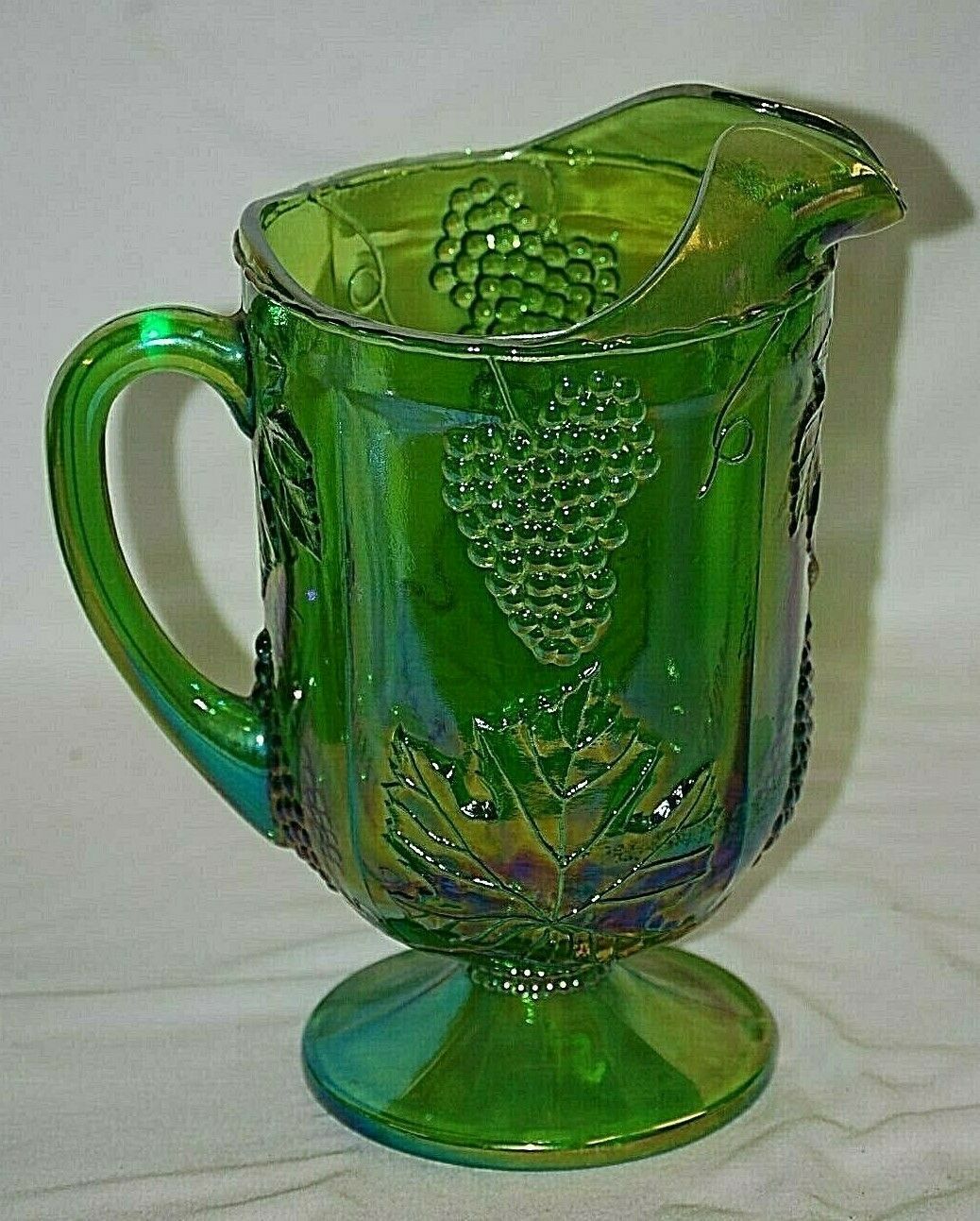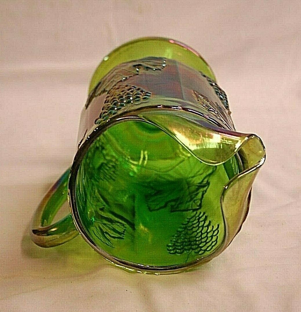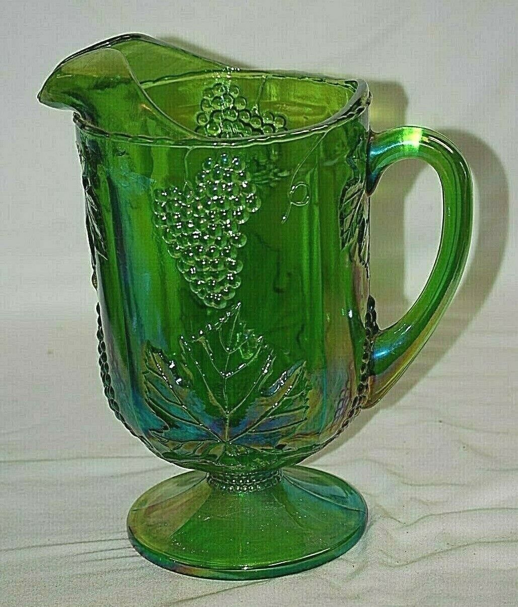 Princess Green Carnival by Indiana Glass Footed Pitcher Embossed Grapes & Leaves