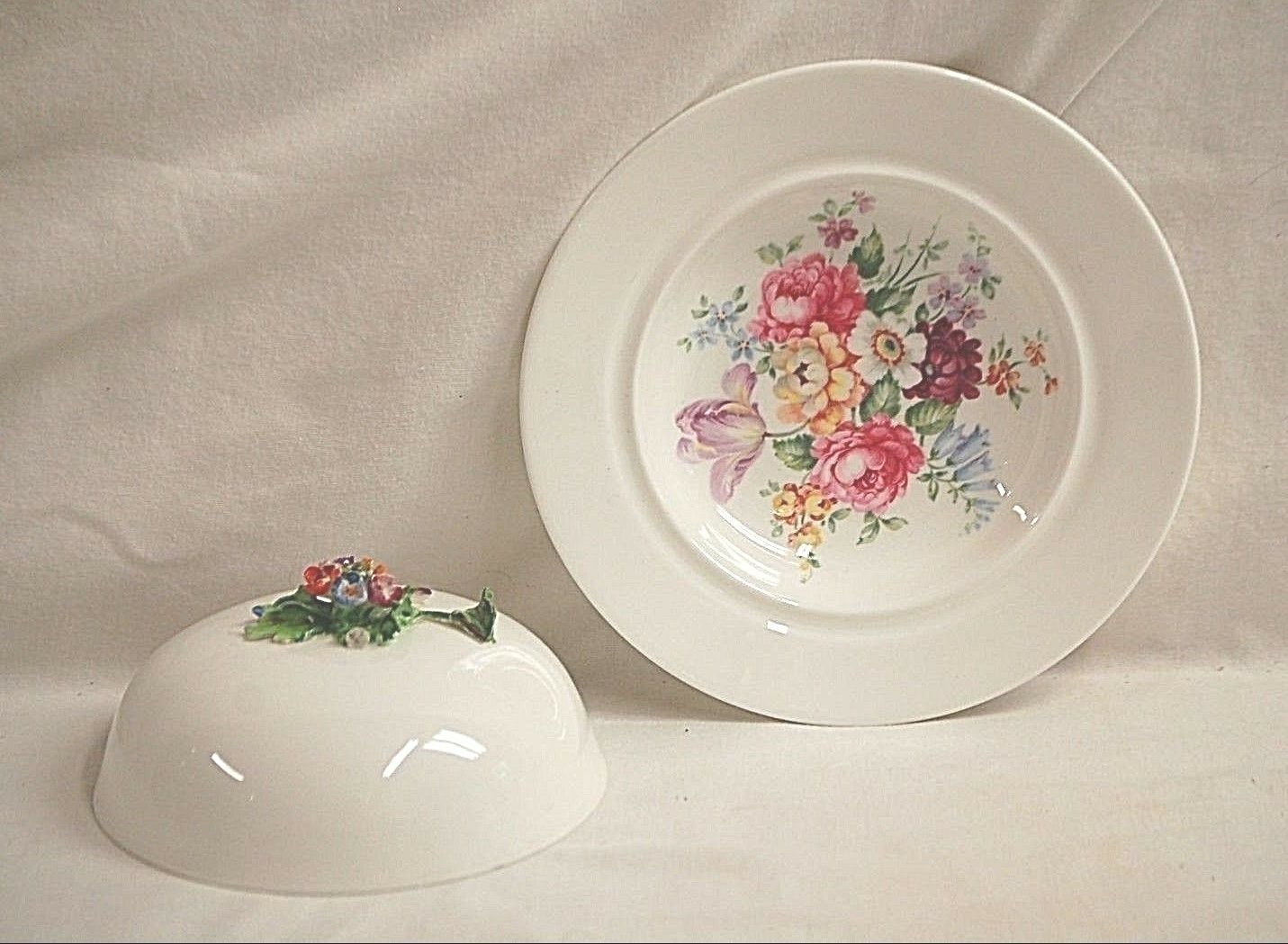 Staffordshire England Fine Bone China Round Covered Butter Dish w Floral Center