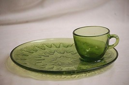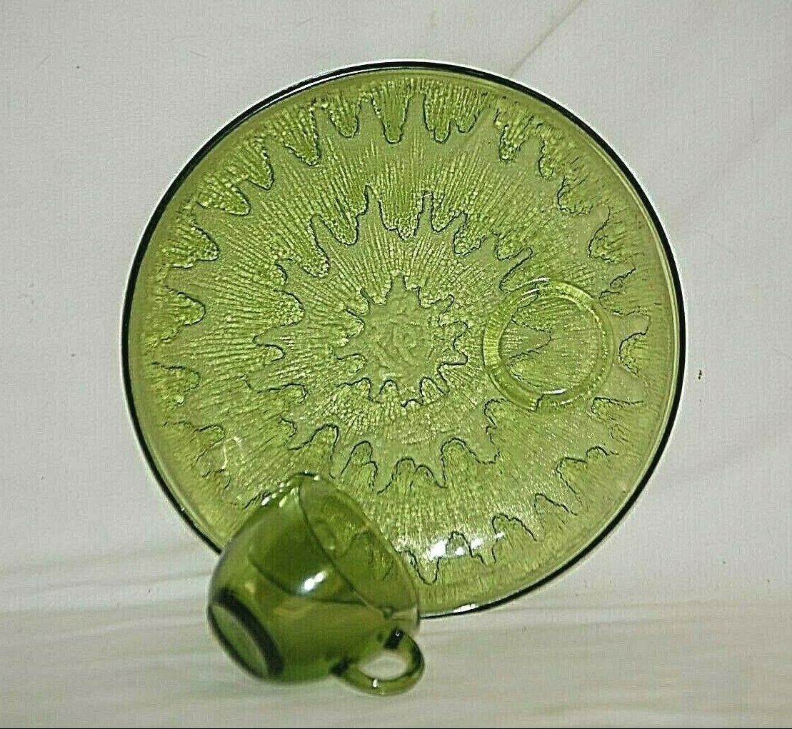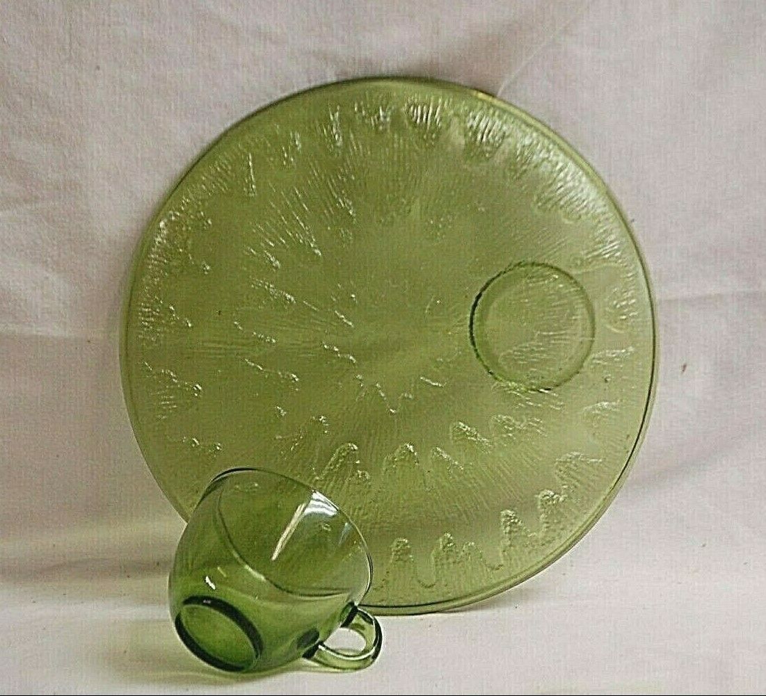 Vintage Sunburst Green by Indiana Glass Snack Plate & Cup Set Textured USA MCM