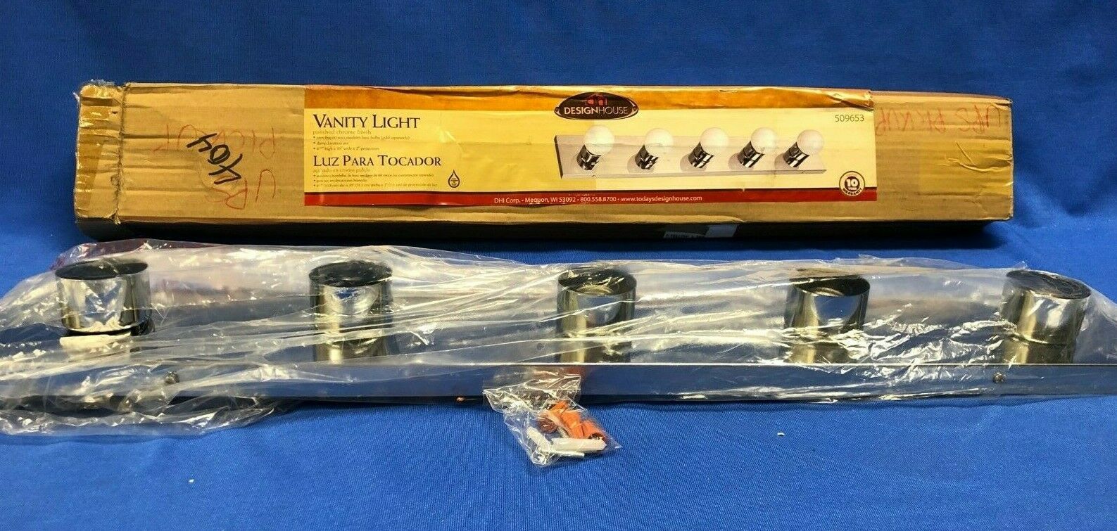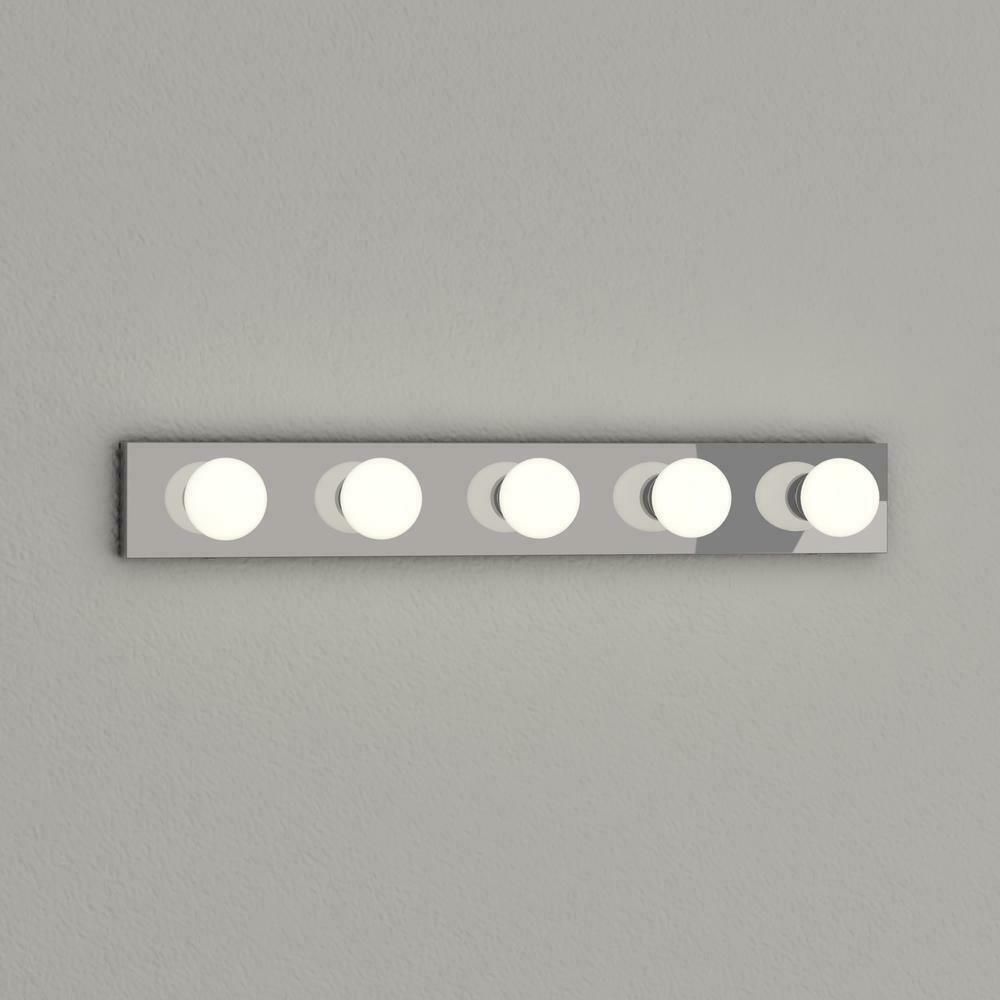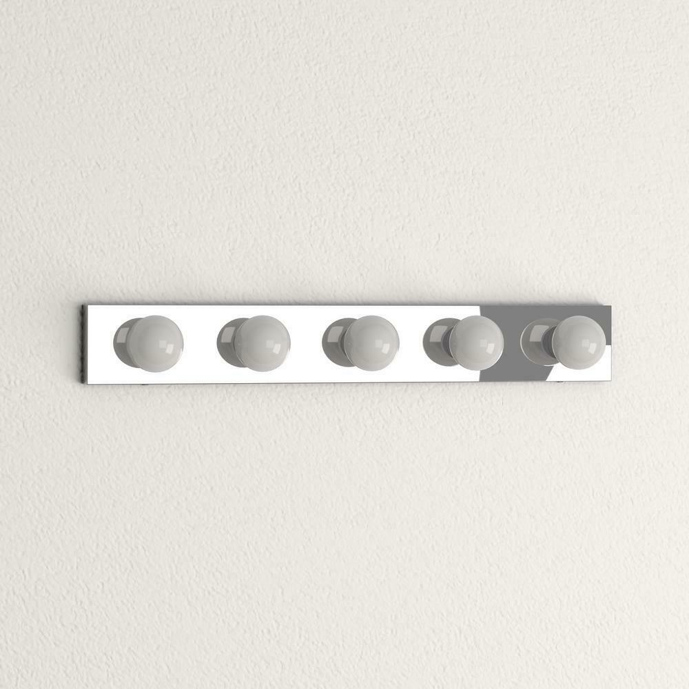 For all of the cleaning, teeth brushing, and makeup applying, the perfect lighting in your bathroom is essential in any home. Create the ideal atmosphere for your daily routines. The Design House 509653 The Village 5-Light Vanity Mount illuminates your bathroom with its timeless configuration and bright aesthetics. This fixture is constructed of formed steel with a polished chrome finish and uses five 60-watt medium base incandescent bulbs. This wall mount's petite design mounts seamlessly to the wall without a chain or visible wires. This fixture can easily be paired with traditional furnishings and mimics the classic Hollywood design. Measuring 4.3 inches by 30 inches, this 3.03-pound vanity can be mounted facing up or down depending on location and preference. This vanity is UL listed, cUL listed and approved for damp areas and is rated for 120-volts. Coordinate your home with the rest of The Village fixtures and furnishings. The Design House 509653 The Village 5-Light Vanity comes with a 10-year limited warranty that protects against defects in materials and workmanship.