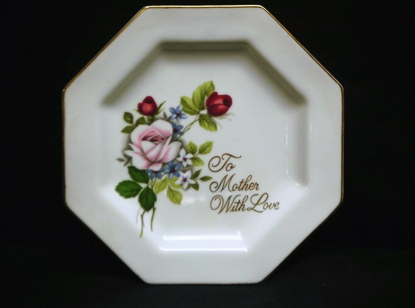 Vintage Plate To Mother With Love White & Pink Roses w Gold Trim Octagon Japan