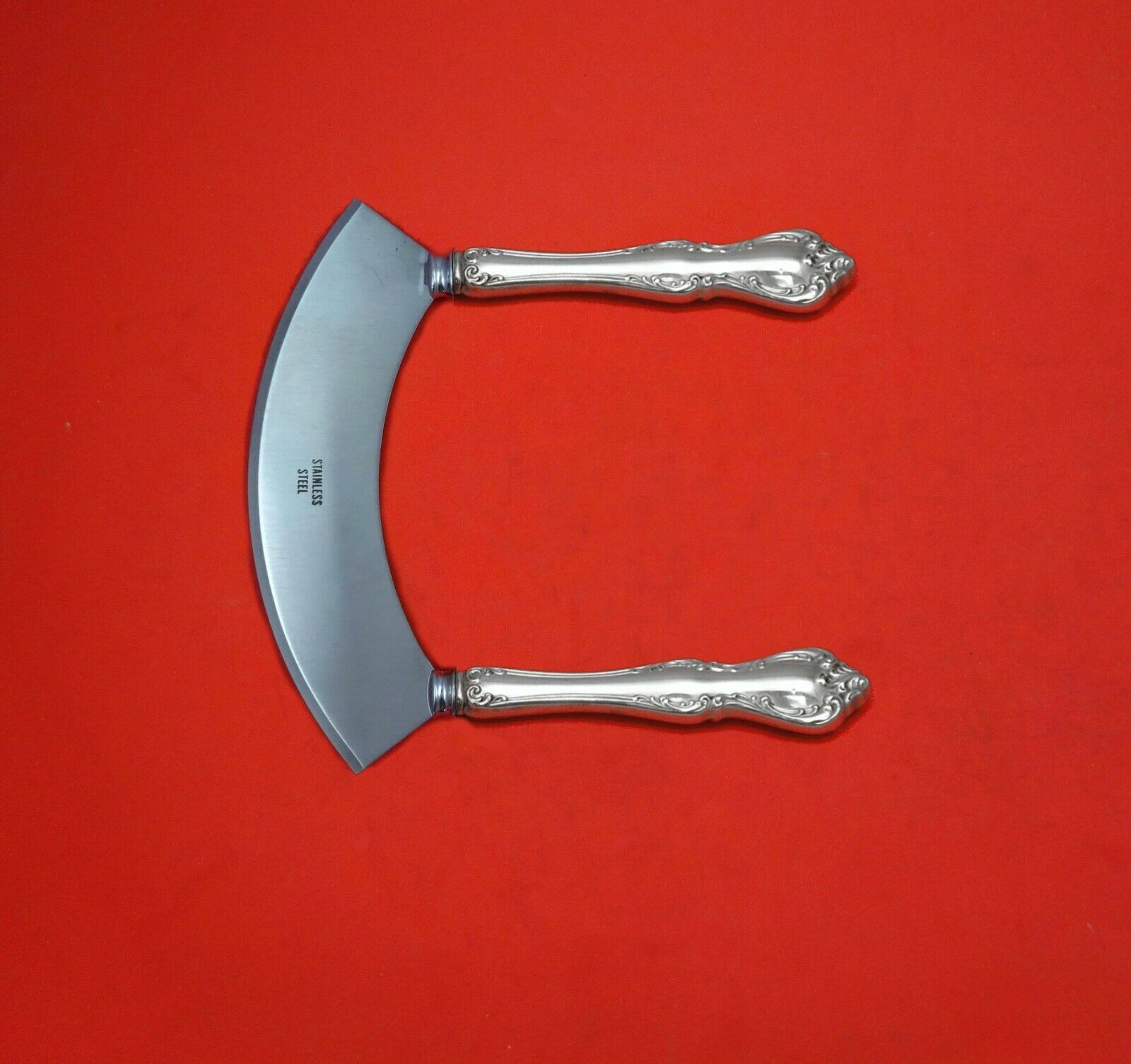 Sterling silver hollow handles with stainless blade Double Handle Mezzaluna Knife (herb chopper) custom made in the pattern Debussy by Towle. This knife features a curved blade which allows 2-handled rocking motion to chop or mince herbs, spices, vegetables, onions, and garlic. Mezzaluna means "half-moon" in Italian, after the curved or crescent shape of the blade. Height measures 6 1/4" to handles; stainless blade measures 5 1/4"L x 1 1/4"Ht. It is not monogrammed and is in excellent condition.
