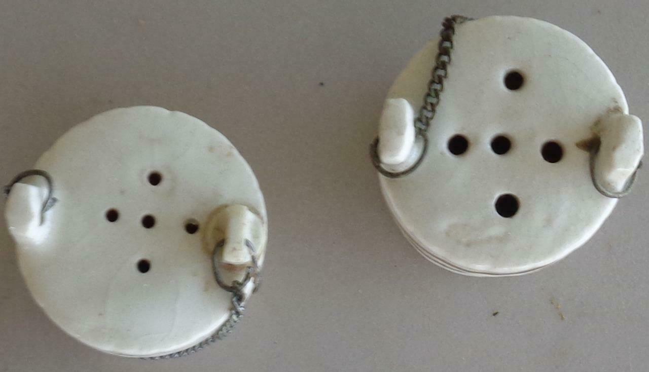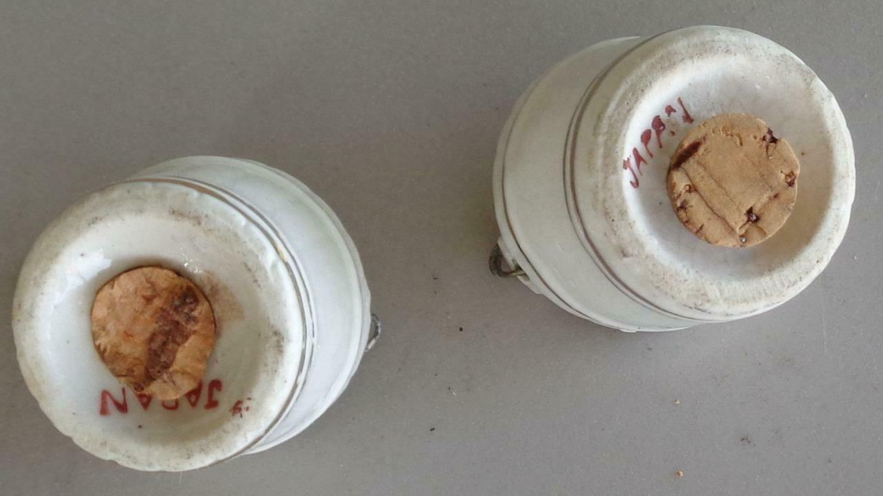 Offered here is this nice Vintage Porcelain Water Bucket Figural Salt Pepper Set. Both pieces are in particularly good condition, with no chips or cracks, although they are a bit dusty and will need to be cleaned up a bit. They each still have the little cork stopper in the bottom. One of the little corks is beginning to break apart. I am unsure of the age of the set, but both pieces are marked Japan on the bottom. Each little bucket measures 1.25” tall, 1” in diameter. The one with the broken cork also has a lot of wear to the gold trim, which is almost completely worn off. This is a very cute little Salt Pepper set, that would be a very nice addition to any S P collection.
