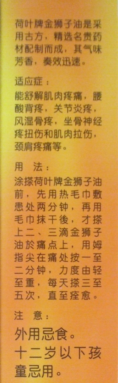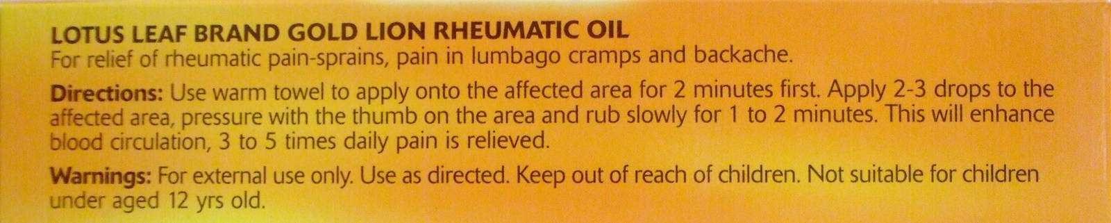 Lotus Leaf Brand Gold Lion Rheumatic Oil is formulated using traditional and superior natural medical ingredients coupled with pain relieving medication, to provide effective pain relief and soothe muscular stiffness.