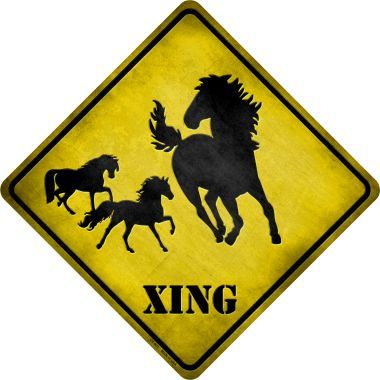 Horse Xing Novelty Metal Crossing Sign. 16.5"X16.5" metal crossing sign, 12"x12' square size.Made of the highest quality aluminum for a weather resistant finish. It is lightweight and durable and has pre-drilled holes for quick and easy mounting. Personalize with ribbon, wire or string. Individually shrink-wrapped and proudly made in the USA.