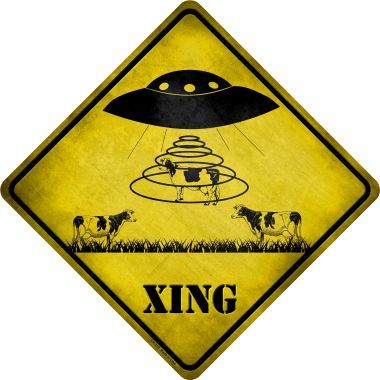 Alien Abduction Xing Novelty Crossing Sign.16.5"X16.5" metal crossing sign, 12"x12' square size.Made of the highest quality aluminum for a weather resistant finish. It is lightweight and durable and has pre-drilled holes for quick and easy mounting. Personalize with ribbon, wire or string. Individually shrink-wrapped and proudly made in the USA.