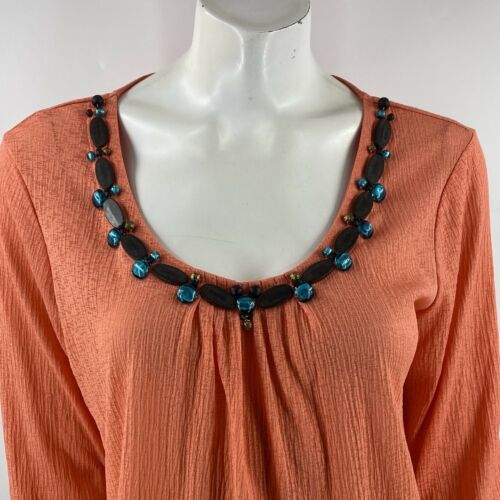 Covington Top Small Coral Orange Beaded Neckline Semi Sheer Embellished Shirt