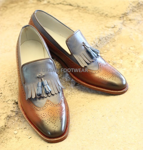New Handmade Men's Rounded Toe Brown & Blue Leather Tassel Loafer Slip On