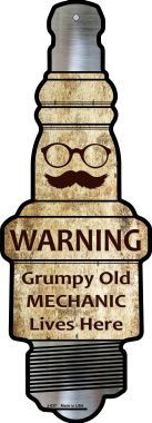 Grumpy Old Mechanic Novelty Metal Spark Plug Sign J-037. 6" x 17" High gloss metal novelty Spark Plugs Sign. Made of the highest quality aluminum for a weather resistant finish. It is lightweight and durable. Pre-drilled holes for quick and easy mounting. Add a ribbon, wire or string to instantly personalize your sign. Individually shrink-wrapped and proudly made in the USA. Most orders ship within 24-48 hours.