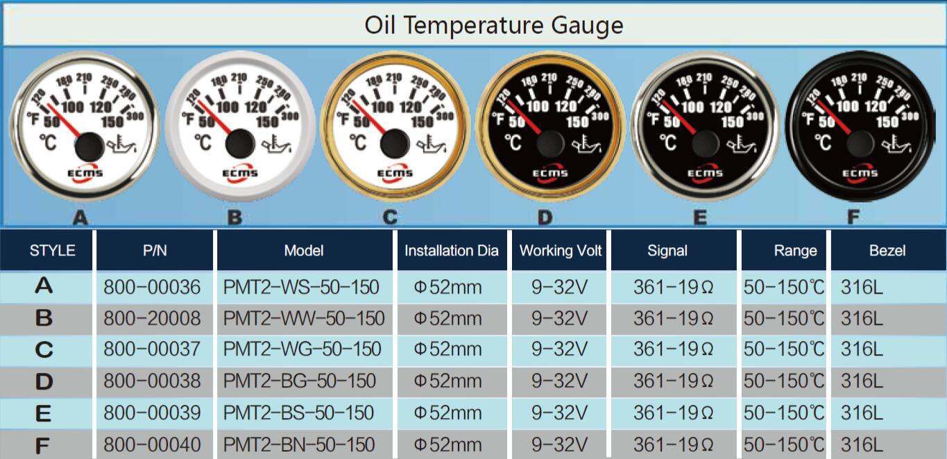 Marine Boat Yacht Engine Generator Oil Temperature Temp Gauge 9-32V 50-150ºC 52mm 2” 361-19?316L Bezel