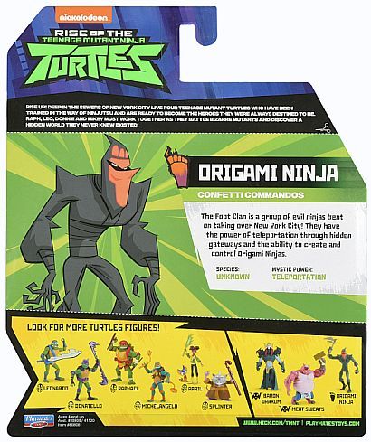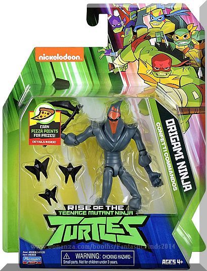 Description: The Foot Clan is a group of evil ninjas bent on taking over New York City! When initiates receive the mark of the 'Flaming Foot,' they gain the power of teleportation through mystic gateways and the ability to create and control Origami Ninjas. Origami Ninja action figures are fully articulated. Accessories included: 3 different sized origami and a reaper blade weapon. Origami Ninjas are 4 1/2" Tall with flaming footprints on their faces. Ages 4+. Brand new factory sealed. 090720-090720P-T2