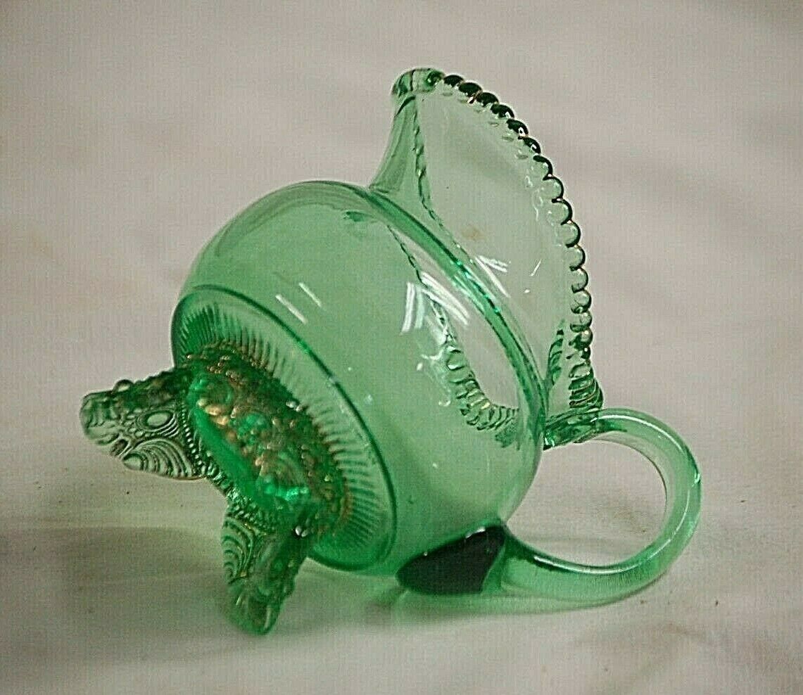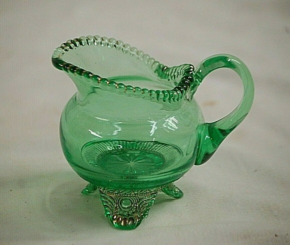 Vintage Green Depression Glass Milk Creamer w 3 Gold Footed Beaded Rim Amy 1922