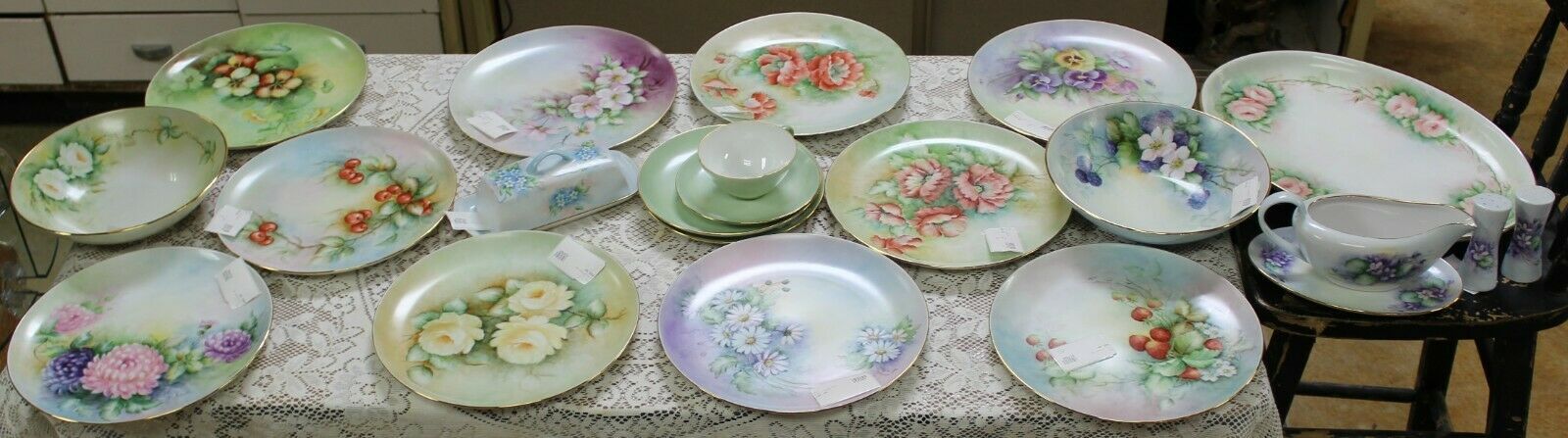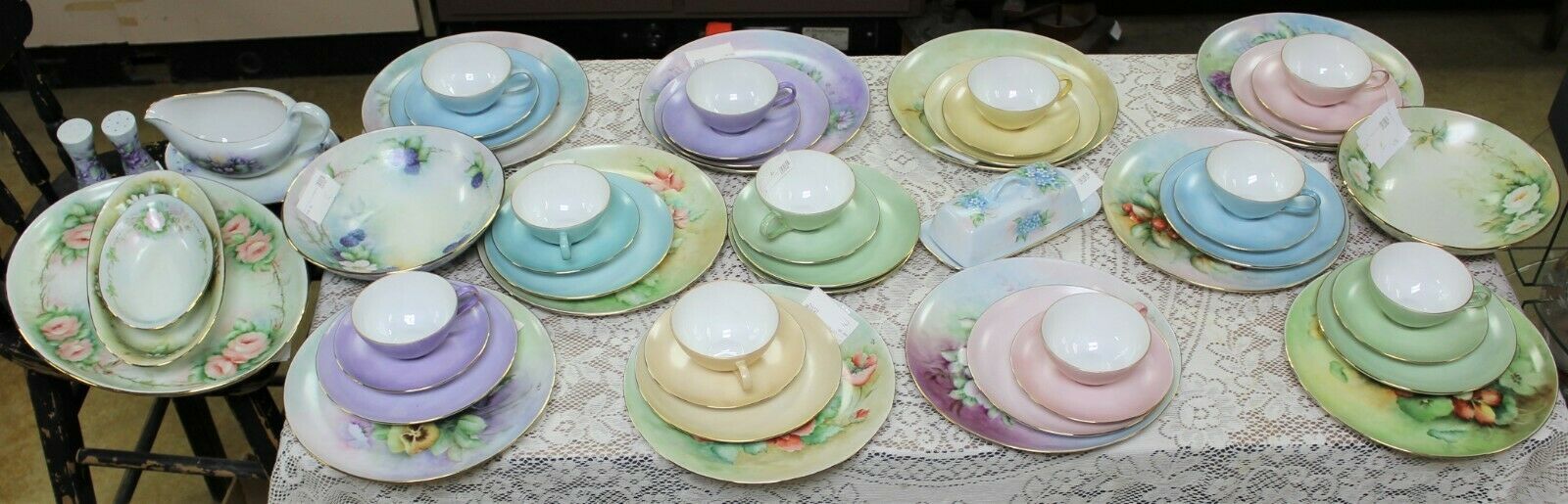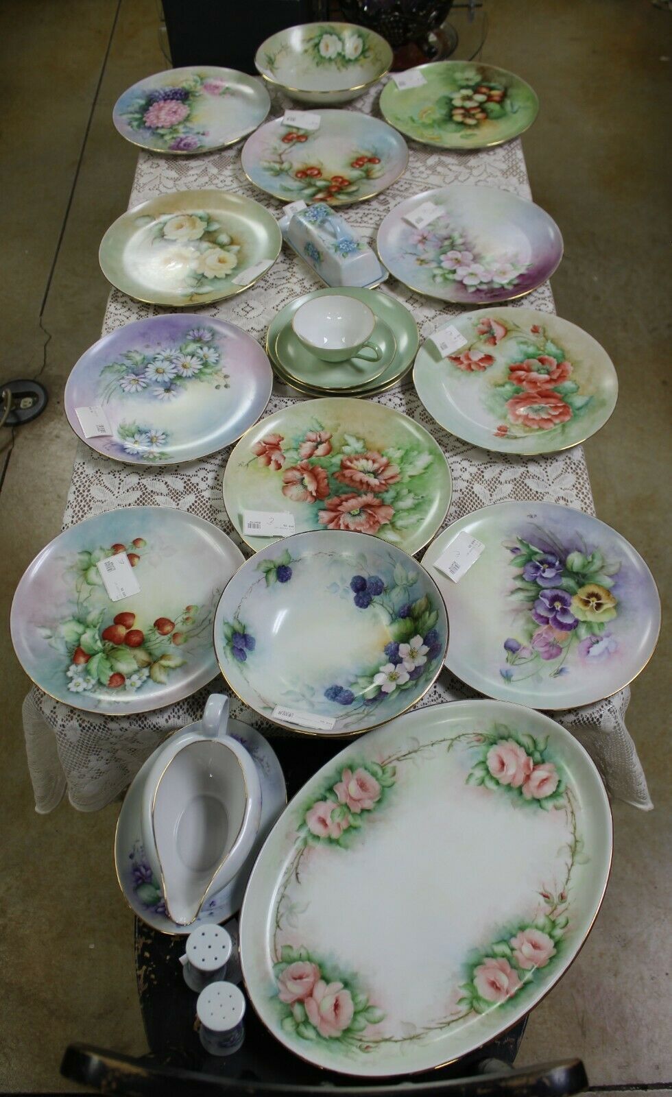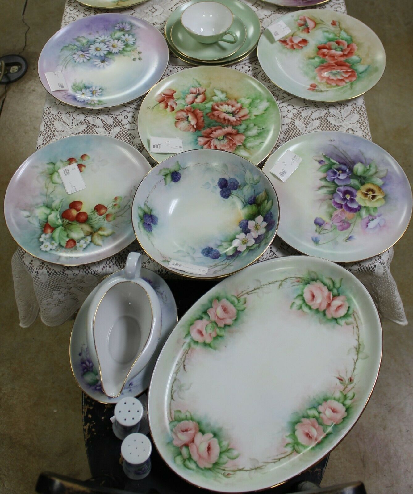 Here at Debi's Attic Gold in Wewoka, Oklahoma we have a Set of 51 pieces of Dishes Hand Painted Signed by V. Lee. This set includes 10 Dinner Plates, 12 Salad/Bread Plates,11 Saucers,11 Cups, Gravy Boat Under Tray, Large Serving Platter,2 Large Serving Bowls, Celery Dish Relish Dish. They come in an assortment of beautiful Pastel colors. (Blue, Purple, Pink, Yellow, Tan, Green) As well as being hand painted with an assortment of flowers fruit. The Salt and Pepper and the covered Butter Dish is no longer part of this set they are just in the photo shootorry