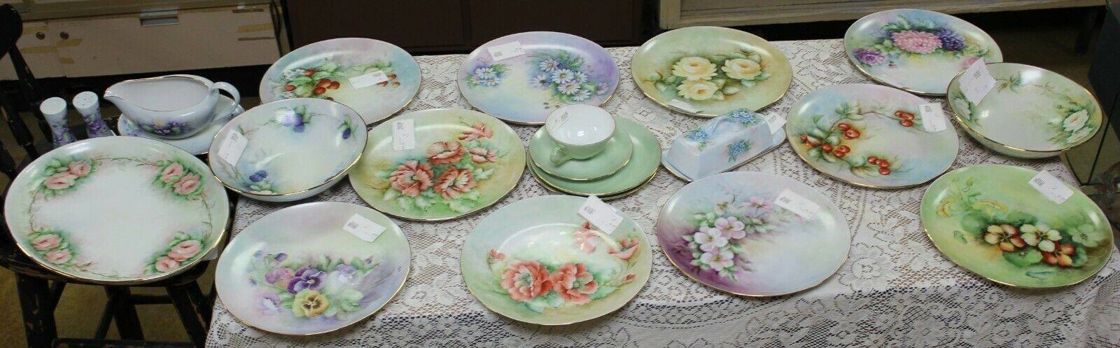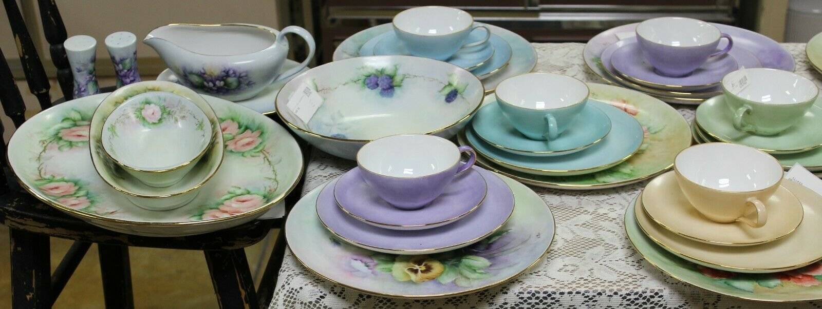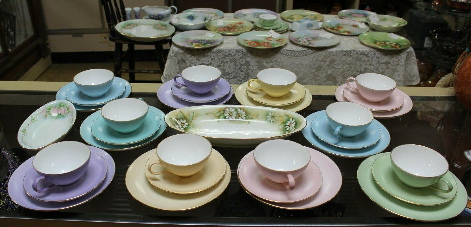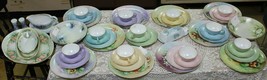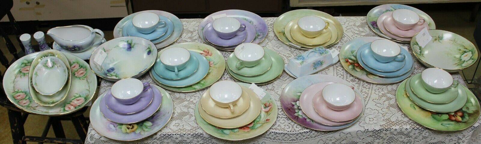 Here at Debi's Attic Gold in Wewoka, Oklahoma we have a Set of 51 pieces of Dishes Hand Painted Signed by V. Lee. This set includes 10 Dinner Plates, 12 Salad/Bread Plates,11 Saucers,11 Cups, Gravy Boat Under Tray, Large Serving Platter,2 Large Serving Bowls, Celery Dish Relish Dish. They come in an assortment of beautiful Pastel colors. (Blue, Purple, Pink, Yellow, Tan, Green) As well as being hand painted with an assortment of flowers fruit. The Salt and Pepper and the covered Butter Dish is no longer part of this set they are just in the photo shootorry