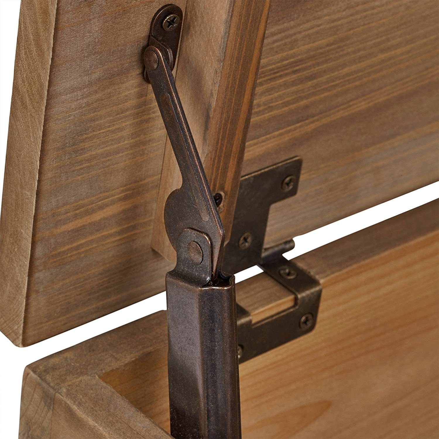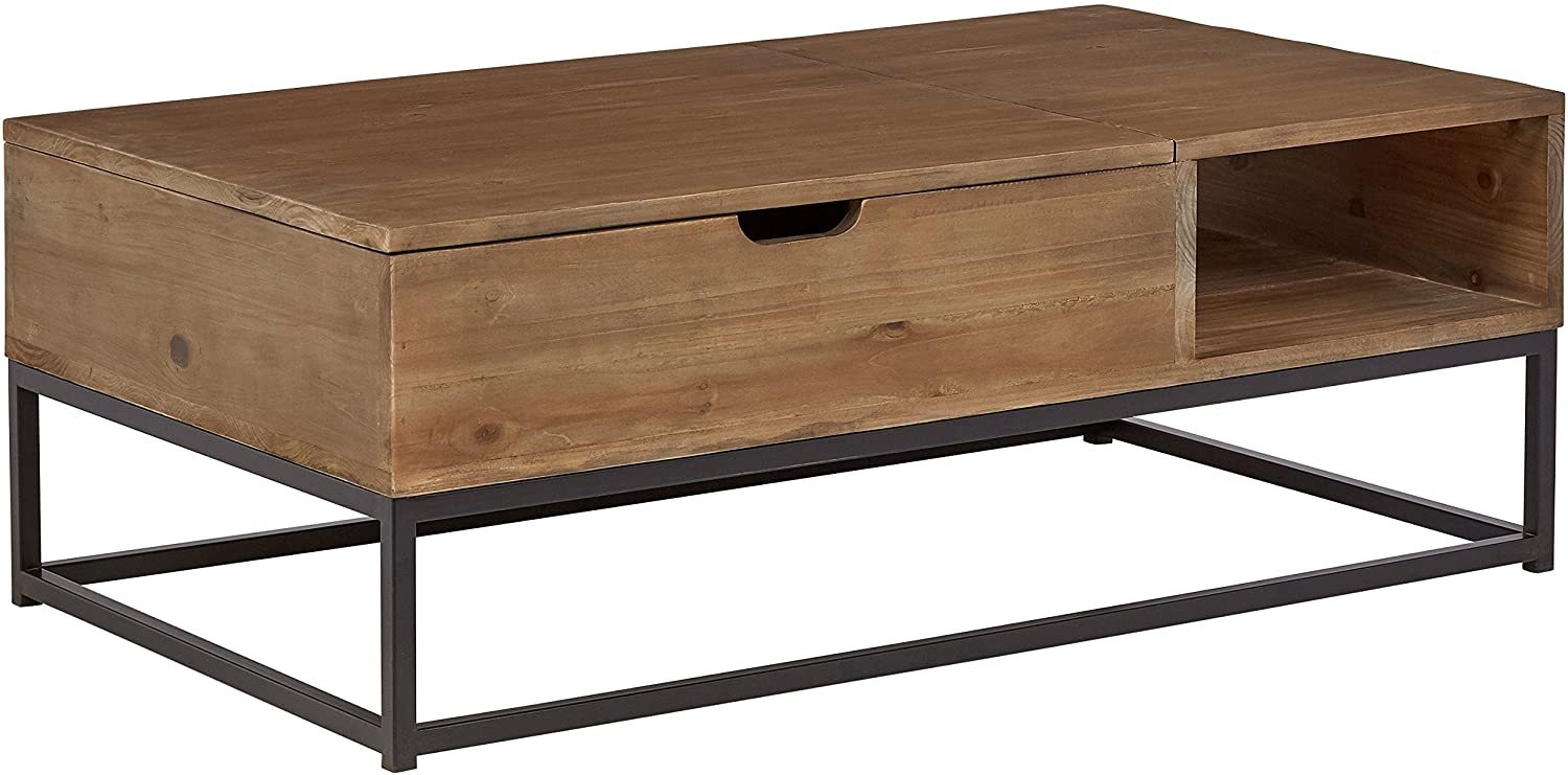 This beautifully simple rustic coffee table has extra function as storage. Just open the top to find convenient space for magazines, remotes and more. Metal legs add a modern touch to a piece ready to blend with any style room.