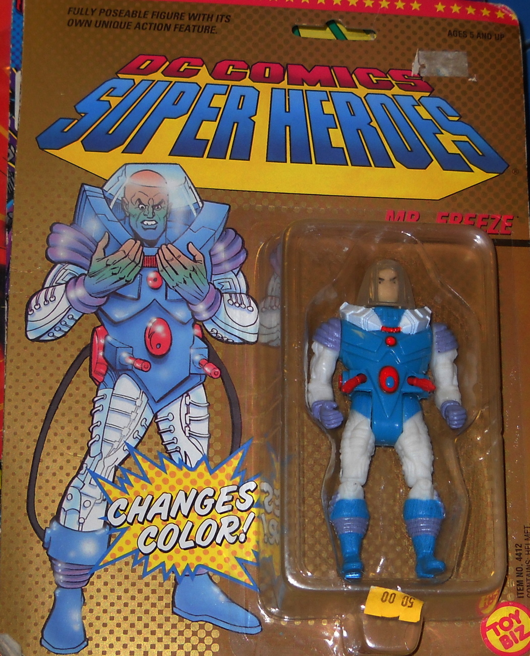 This super Hero From DC Comics is Mr Freeze. He's s from the Batman series. Mr Freeze is brand new in his package. He changes color if he is not in his own freezing environment. If you take his helmet off he turns blue. That's kinda cool! If you have questions email me with them. Also take a look at our other great action figures and collectable toys that we have and have a great day!