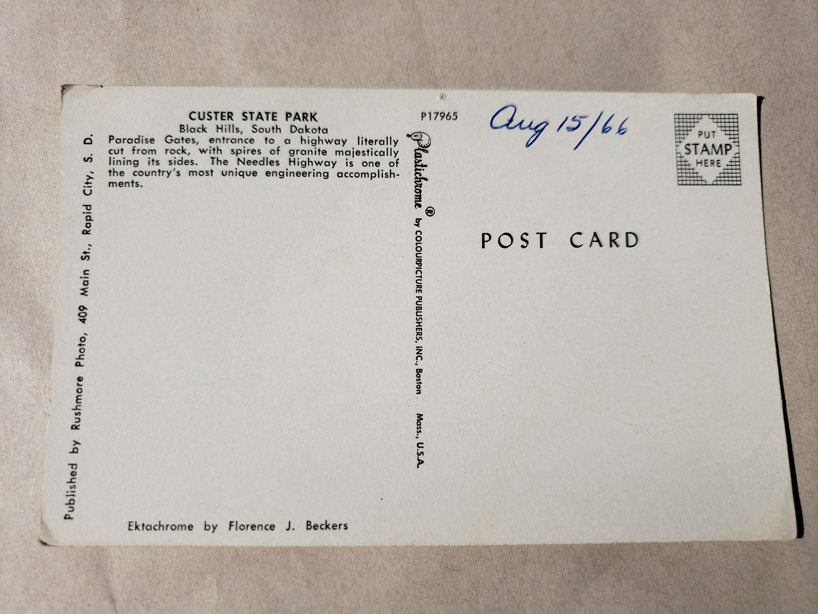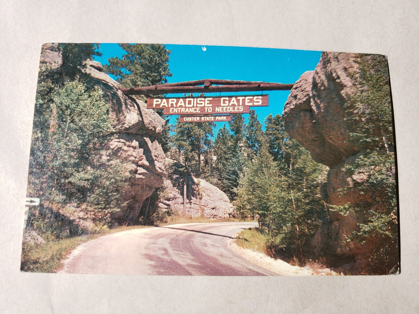 Up for sale is a vintage postcard by Colorpicture Publishers. It has a colour picture of the Paradise Gates in Custer State Park in South Dakota. The picture on the card dates to the 1960s. What a great addition to any collection.