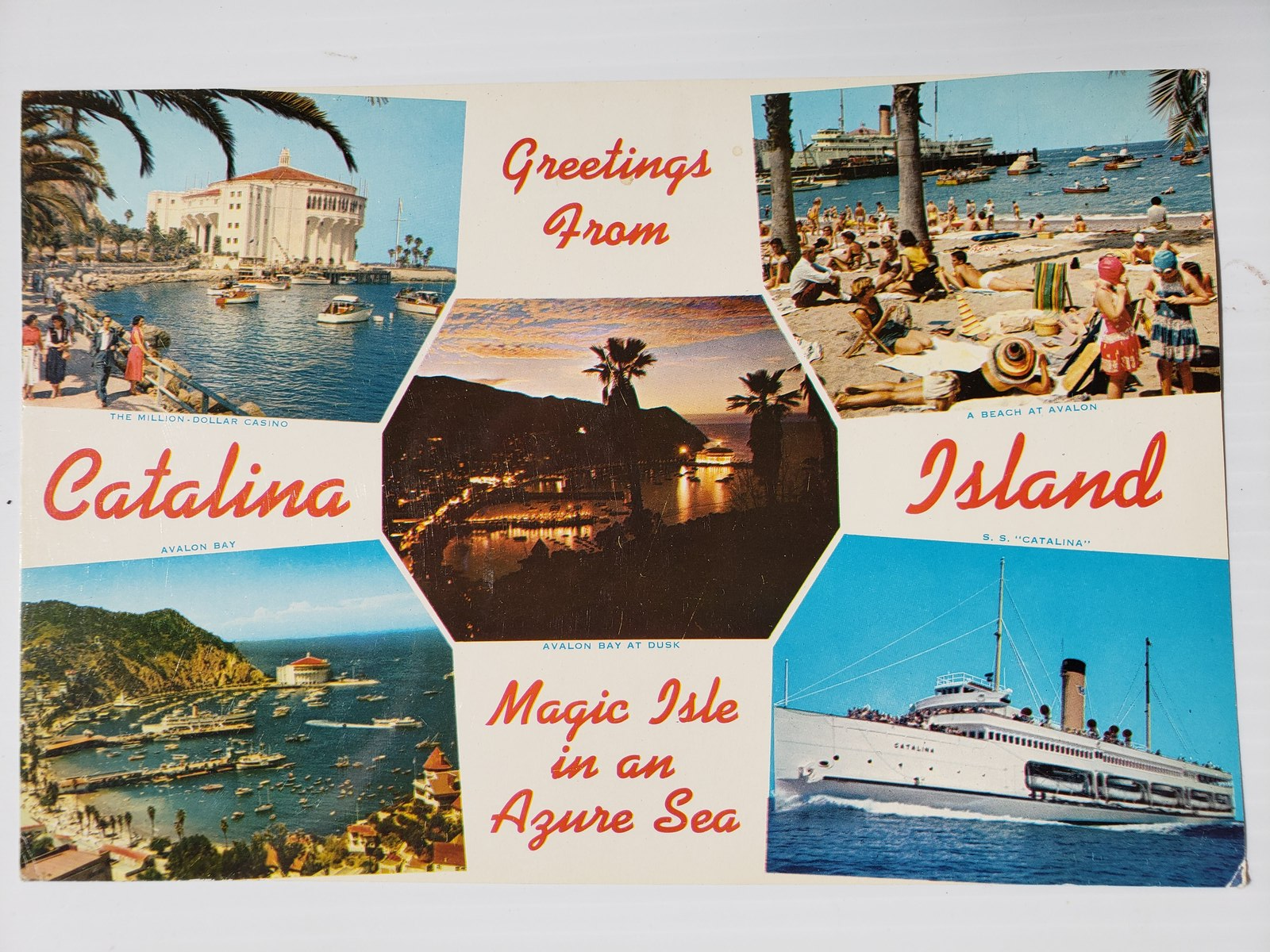 Up for sale is a vintage postcard by S. Crocker. The postcard has 5 images on it. These images are Catalina at night, the Avalon Casino, the SS Catalina, Avalon Bay and the beach at Avalon Bay. Inbetween the pictures is the wording greetings from Catalina Island. What a great addition to any postcard collection.