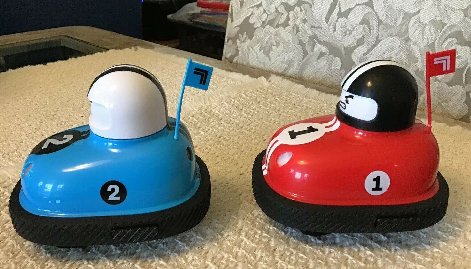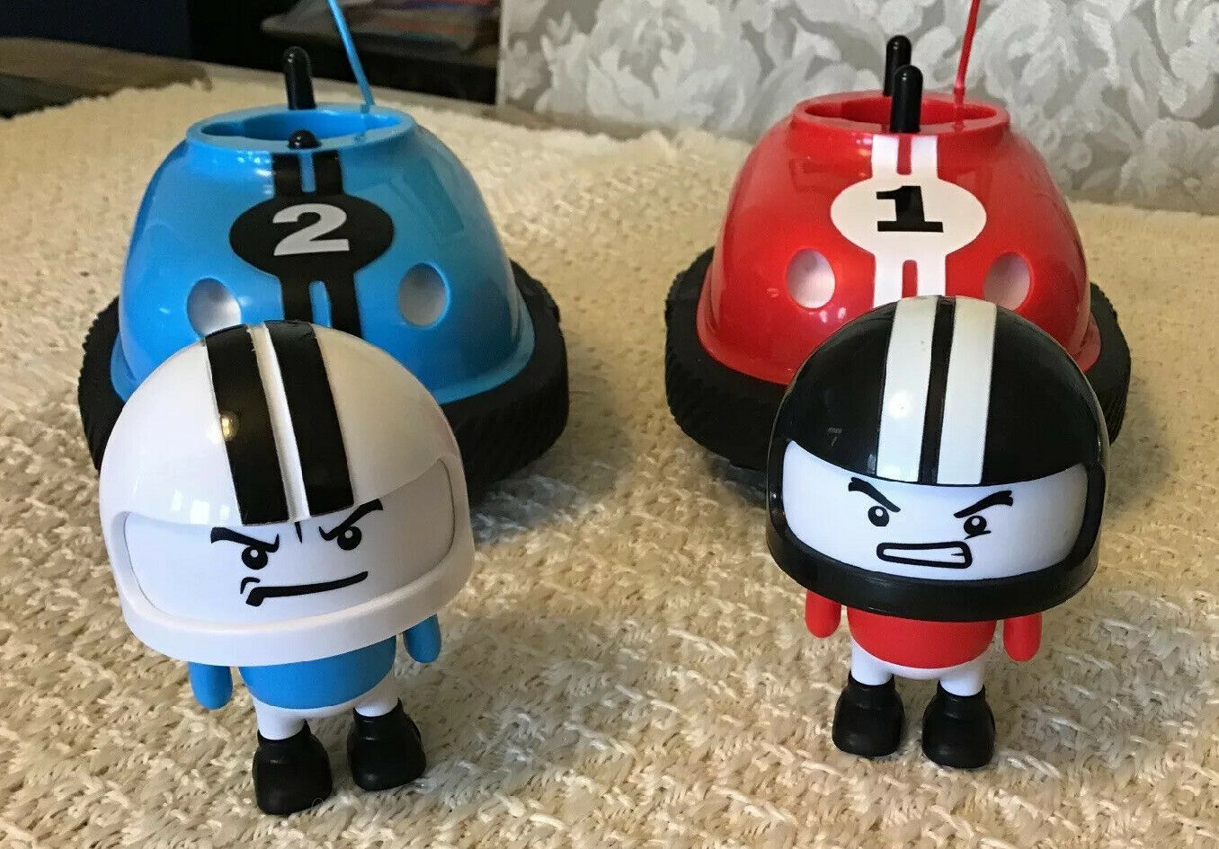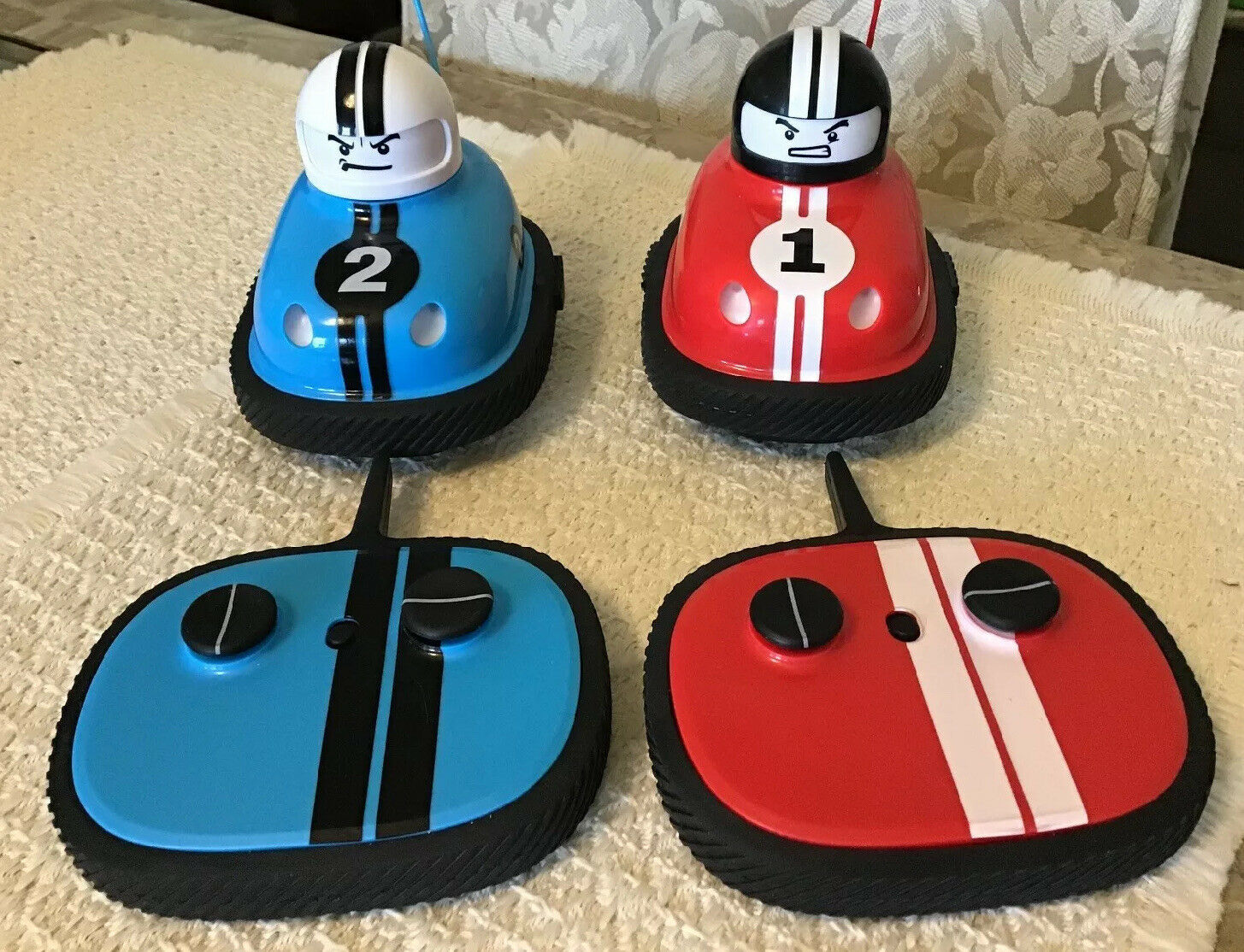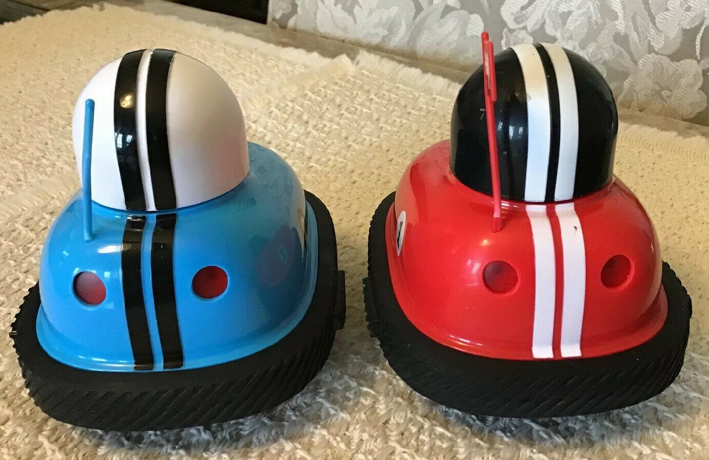 IMPORTANT TO NOTE: There is a button on each side of the Bumper Cars - that has to be hit - in order to send the racer flying . Head on collisions (impact) will not do it. Make sure you understand this! This listing (cars and remotes) are Sold "As Is." Absolutely no returns and/or refunds! PLEASE REFER TO THE INCLUDED PICTURES IN ORDER TO UNDERSTAND EXACTLY WHAT YOU WILL BE PURCHASING.