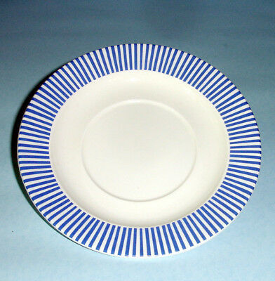 • Repeated pattern of blue stripes encircle the rim of this saucer