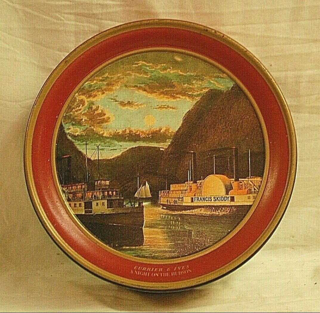 Vintage Currier & Ives Red Metal Tin Night on Hudson Francis Skiddy Paddle Wheel
