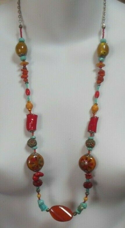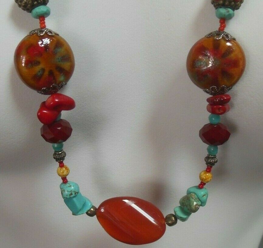 Handmade Turquoise, Coral, Art Glass Bead Necklace