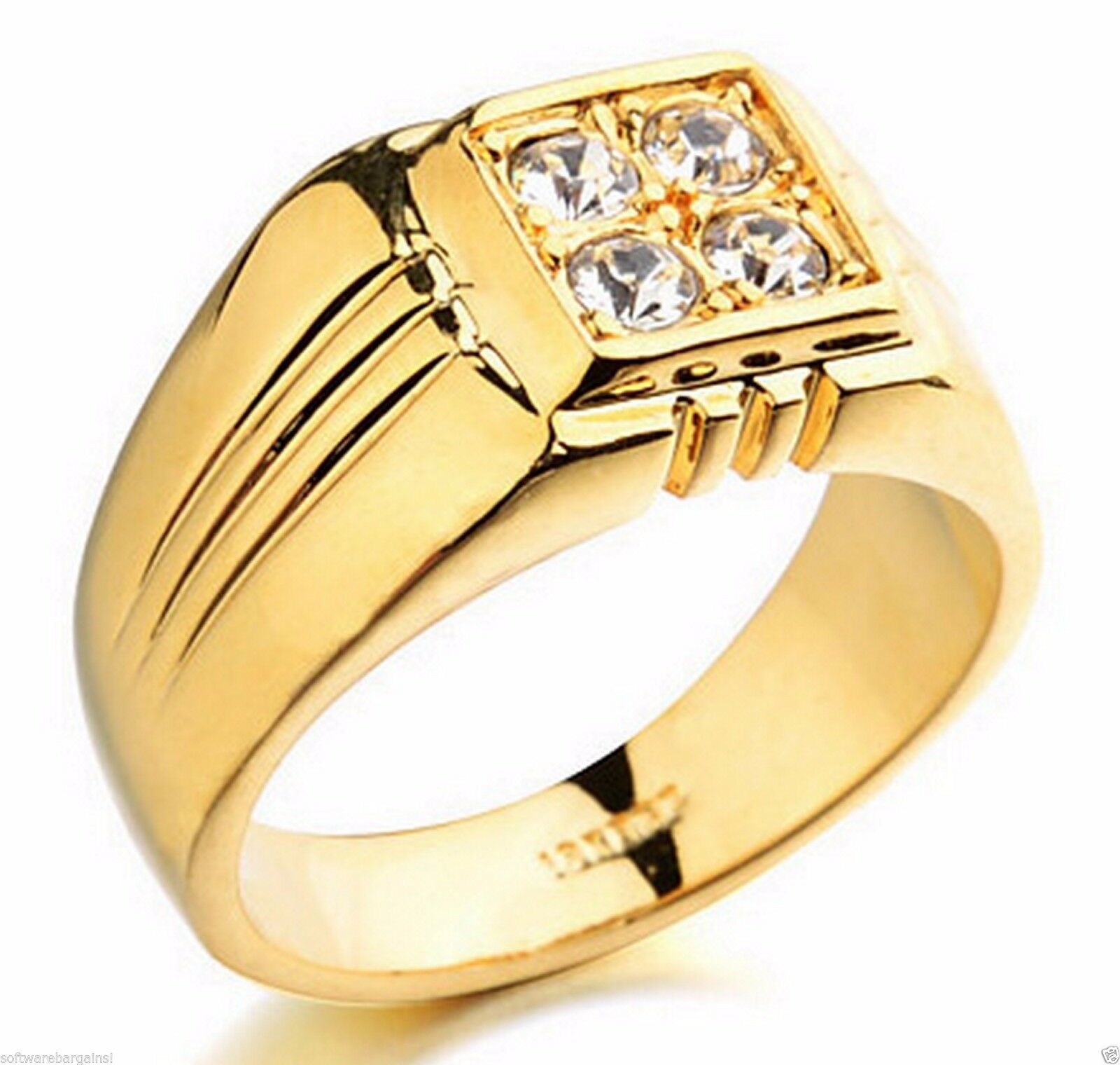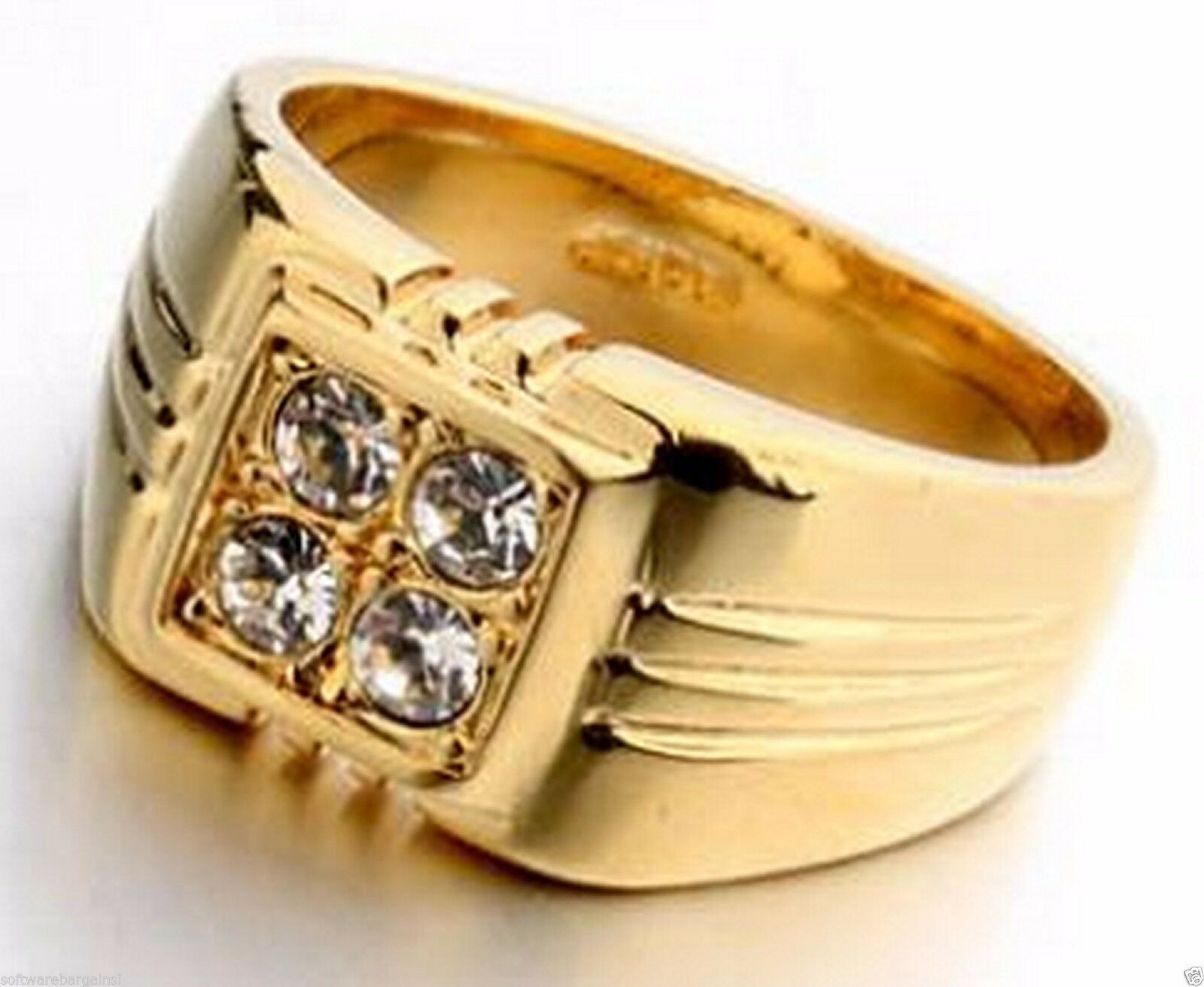 GREAT LOOKING MEN'S 18K GOLD PLATED 4 STONE RING. GREAT LOOKS WITHOUT THE HIGH PRICE! INCLUDES NICE DARK BLUE VELVET RING CASE.
