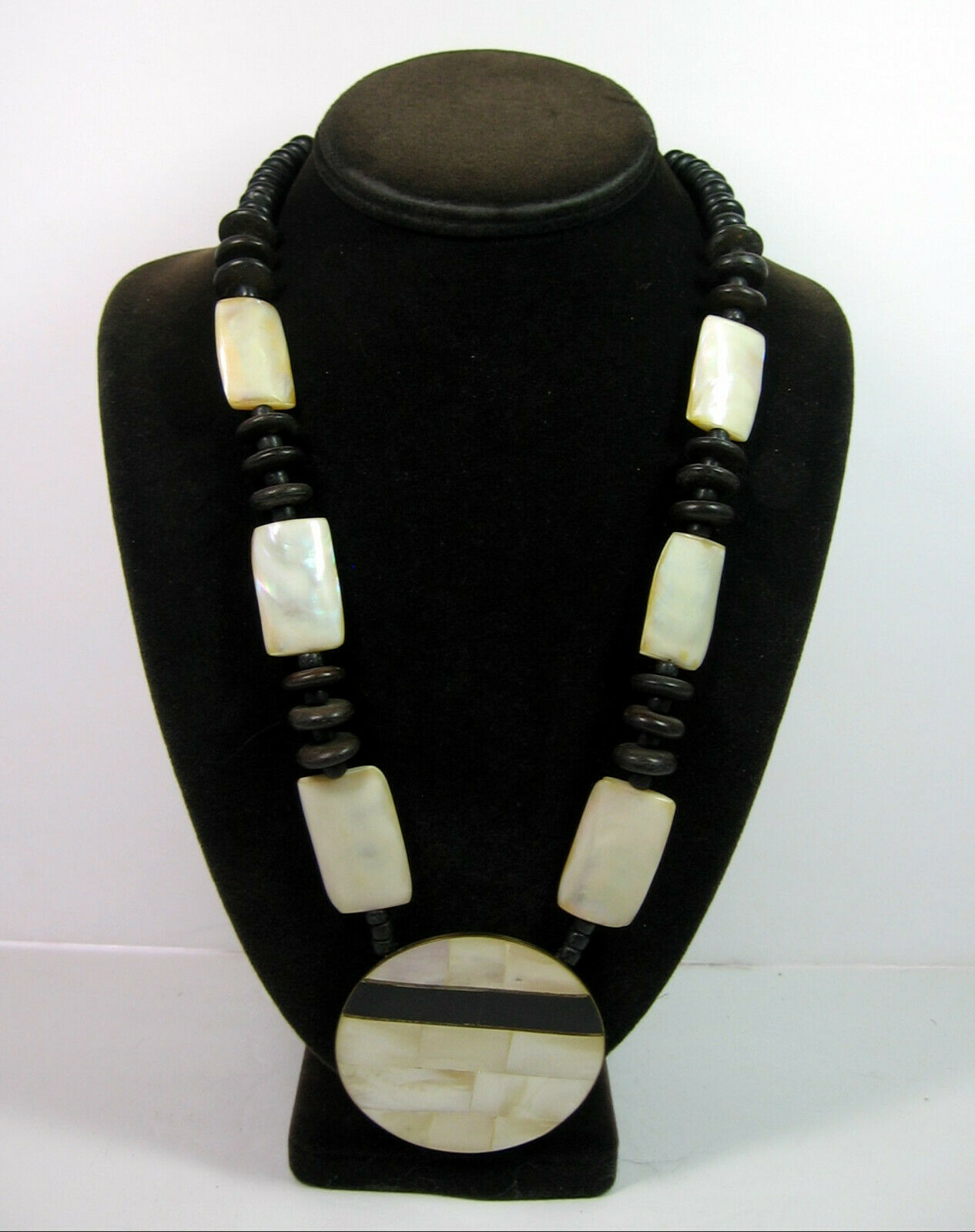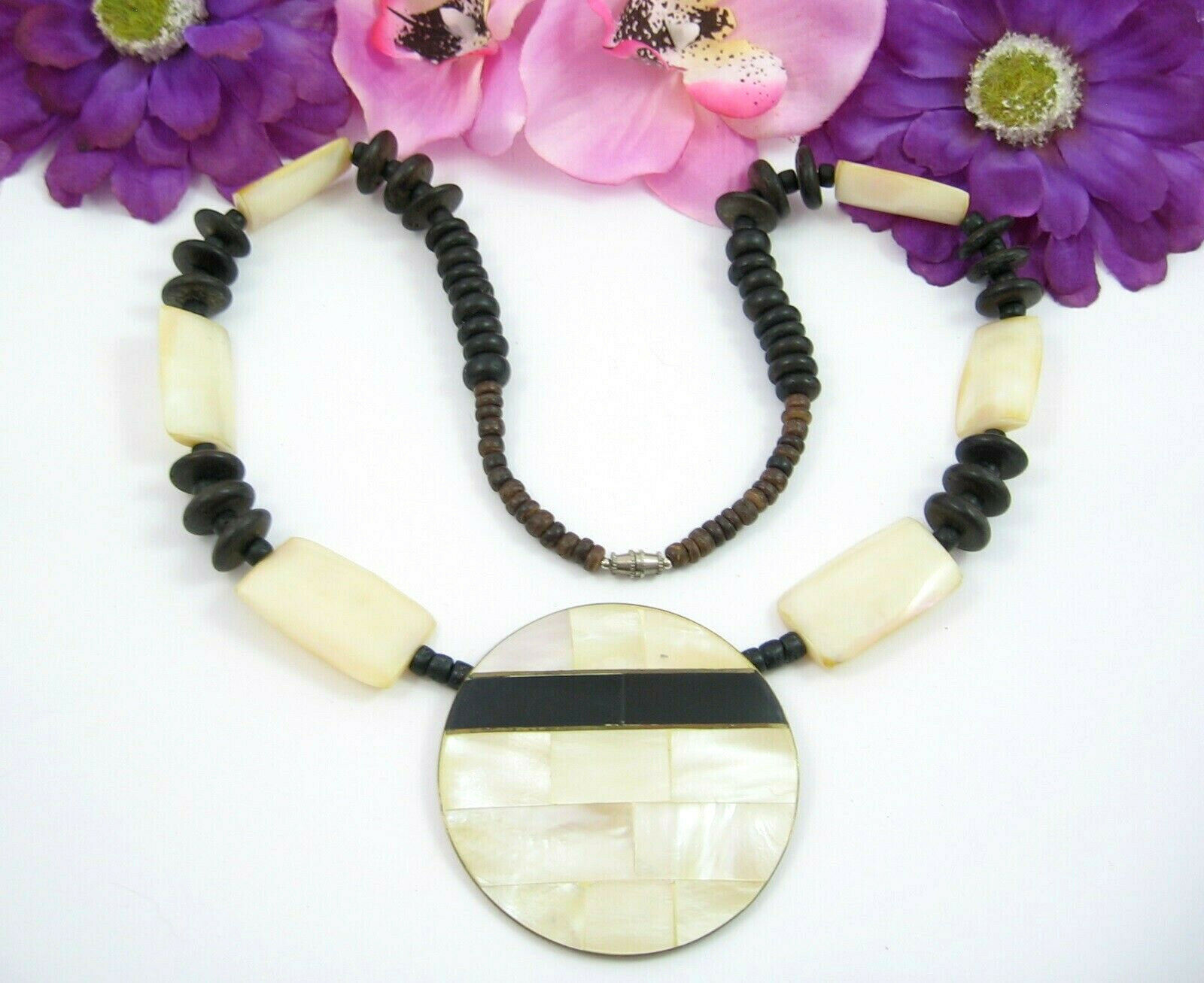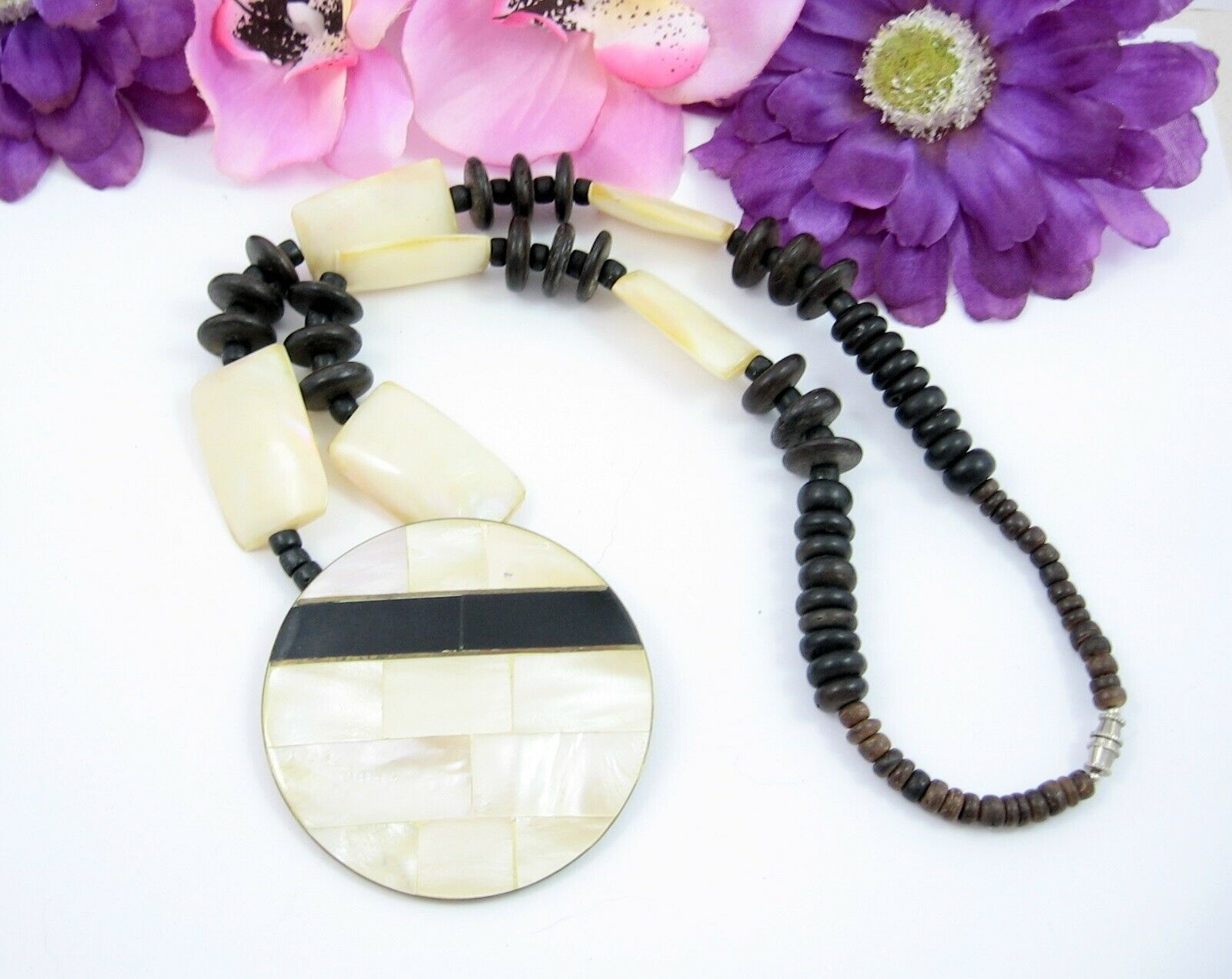 This is a vintage MOTHER OF PEARL and BLACK ENAMEL MEDALLION NECKLACE!