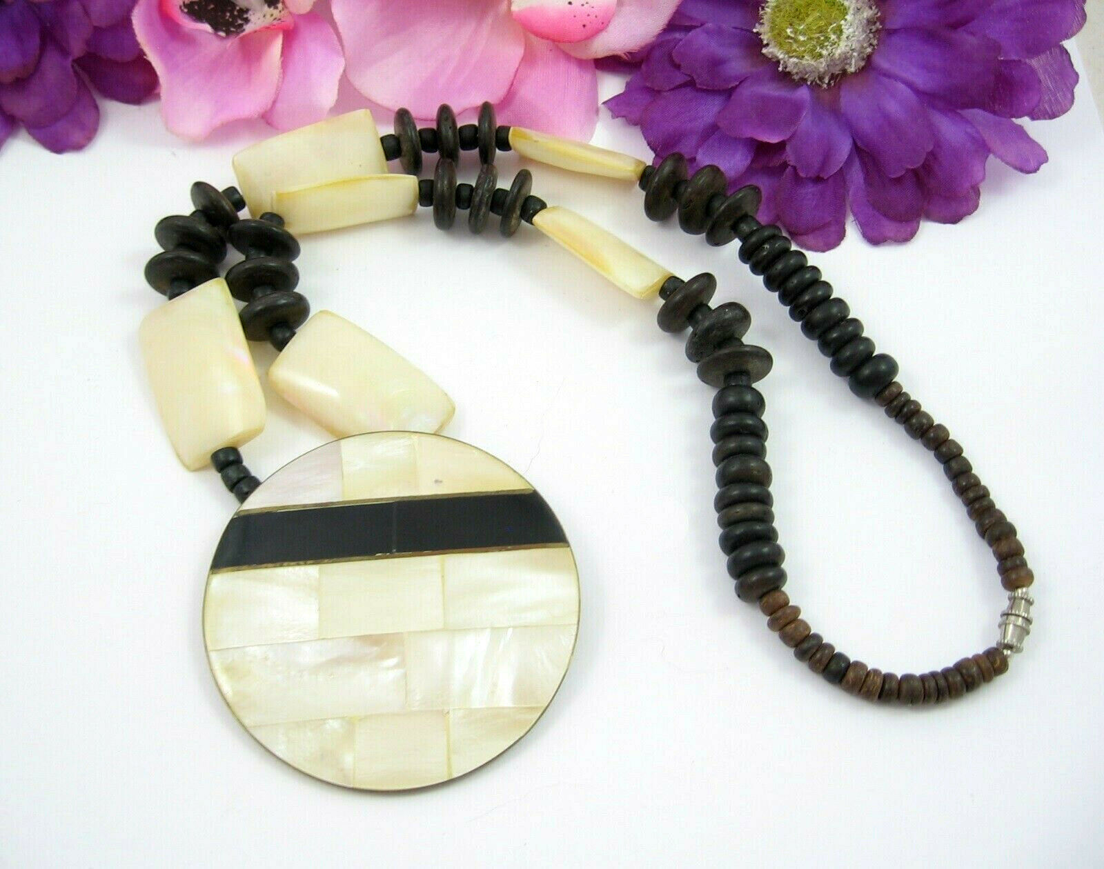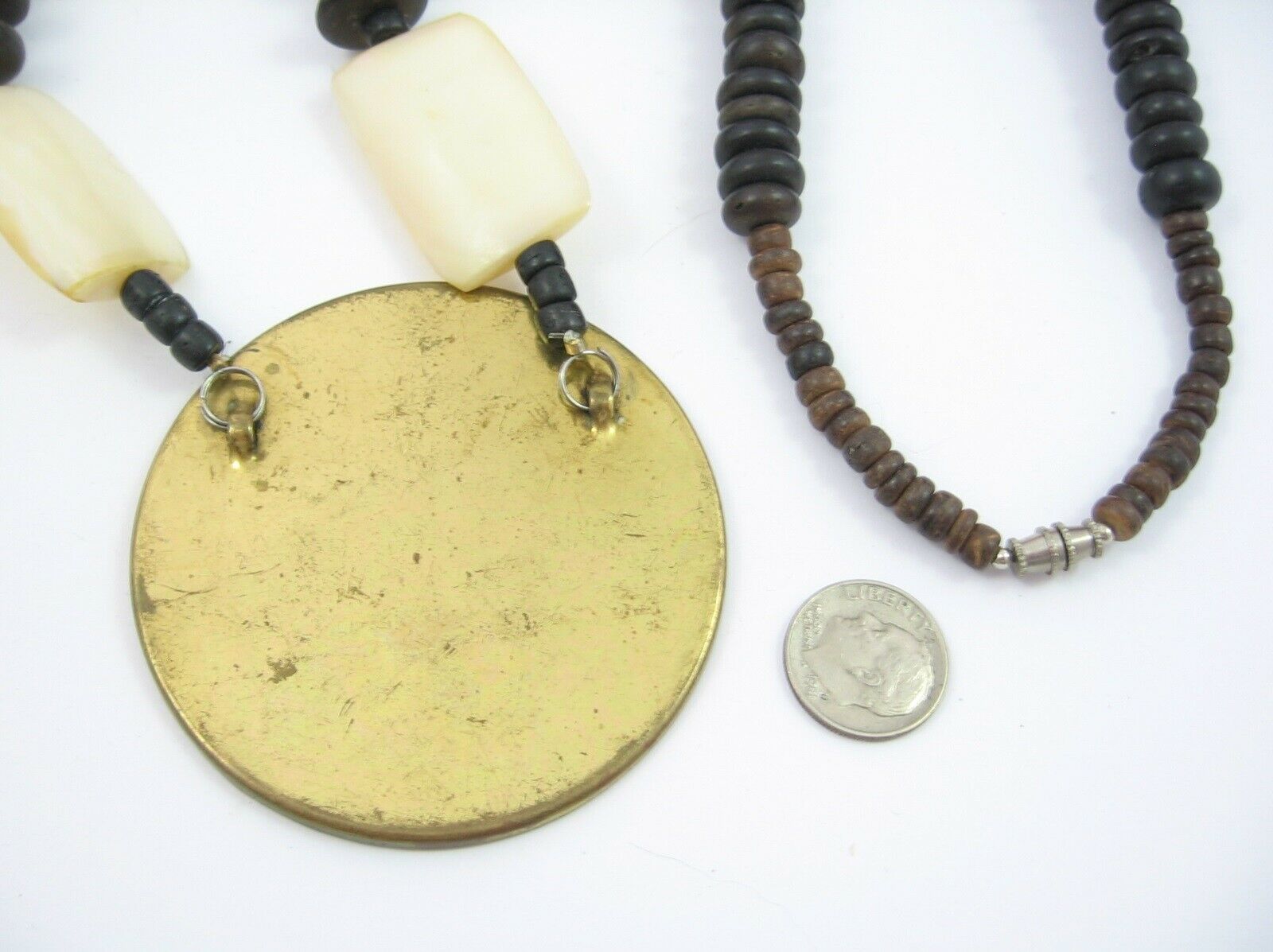 MOP SHELL MEDALLION Big BEADS NECKLACE Vintage Brown Beaded BRASS Pendant
