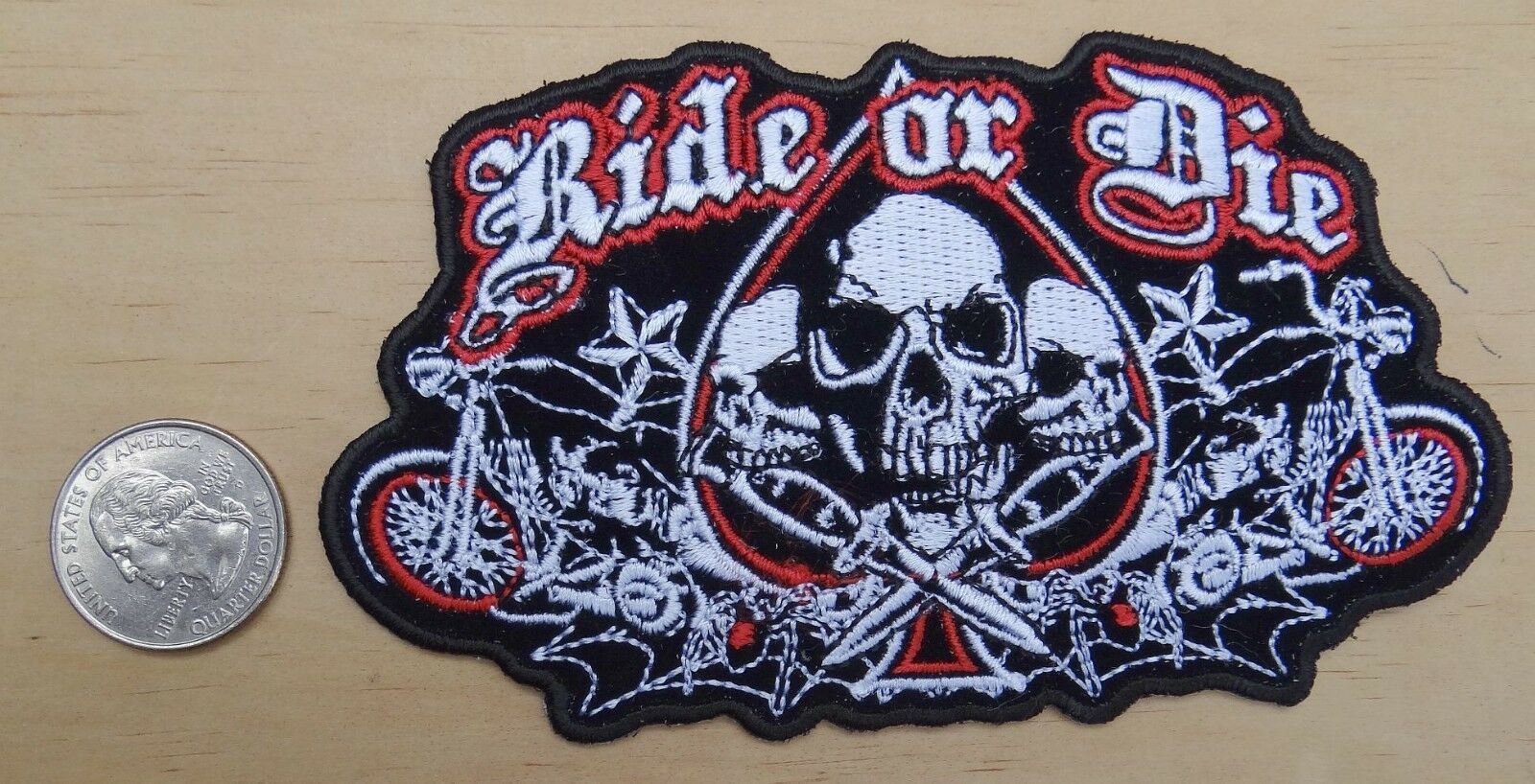 RIDE OR DIE SKULLS BIKES SPADE IRON-ON / SEW-ON EMBROIDERED PATCH 5" X 3 "