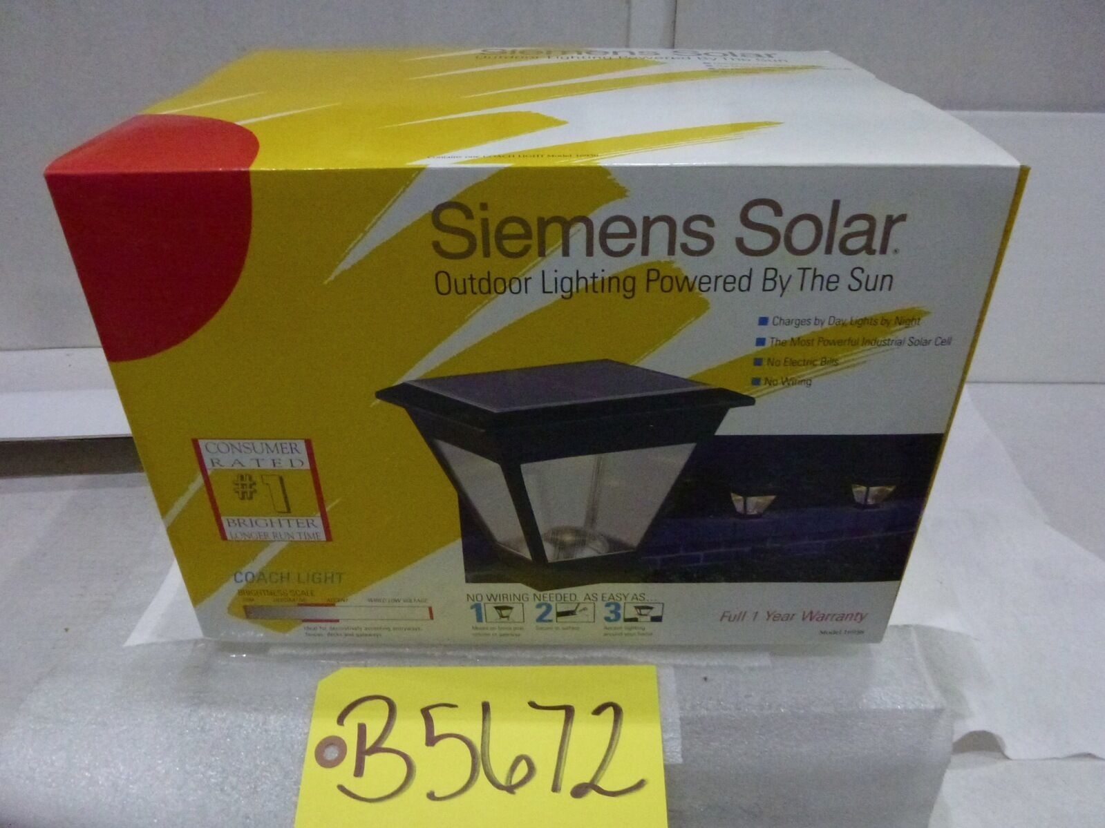 Siemens Solar Coach Lights, Model #16938. Outdoor lighting power by the sun. Charges by day, lights at night. The most powerful Industrial Solar-cell, no wiring.