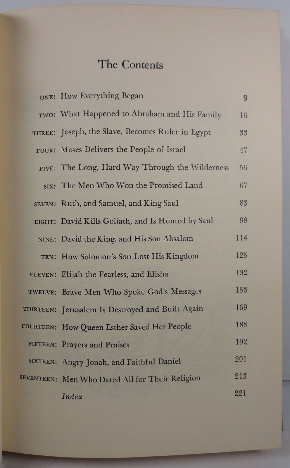 Contents: How Everything Began, What Happened to Abraham and His Family, Joseph the Slave Becomes Ruler of Egypt, Moses Delivers the People of Israel, The Long Hard Way Through the Wilderness, The Men Who Won the Promised Land, Ruth and Samuel and King Saul, David Kills Goliath and is Hunted by Saul, David the King and His Son Absalom, How Solomon's Son Lost His Kingdom, Elijah the Fearless and Elisha, Brave Men Who Spoke God's Messages, Jerusalem is Destroyed and Built Again, How Queen Esther Saved Her People, Prayers and Praises, Angry Jonah and Faithful Daniel, Men Who Dared All for Their Religion (#0000119)