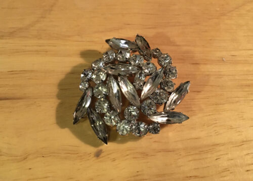 Swirl Rhinestone Pin. Preowned in good condition. Measures 1 3/4 inches in diameter. A few of the long edge rhinestones are dark around the tips. No markings.