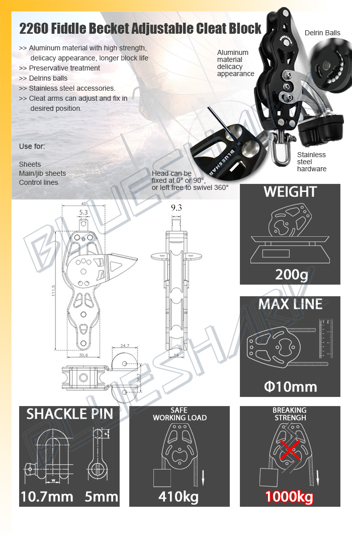 For this sailboat block, you can choose the block that comes with the cam cleat or the block that does not include the cam cleat.